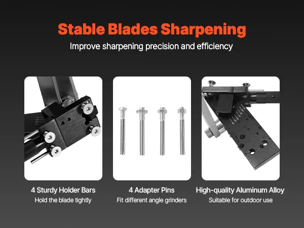 The 4 adapter pins ensure compatibility with various angle grinders, 4 sturdy holder bars securely hold the blade in place, and the 25mm diameter enlarged handle provides a comfortable, secure grip, reducing hand fatigue and improving control during sharpening.
