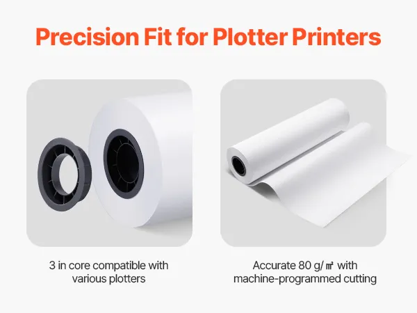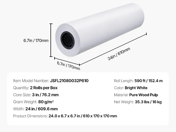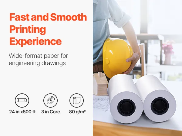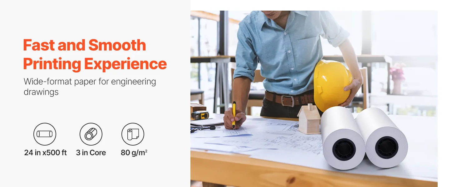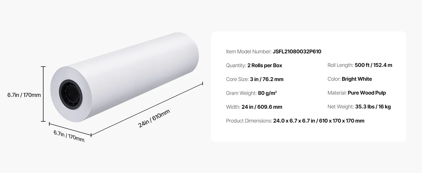 Standard Size Rolls: This wide-format paper comes in a box of two rolls, each with a width of 24 inches (609.6 mm) and a total length of 500 feet (152.4 m). It provides precise, continuous printing results ideal for large-scale engineering drawings and architectural blueprints. The 3-inch core fits most standard engineering printers.