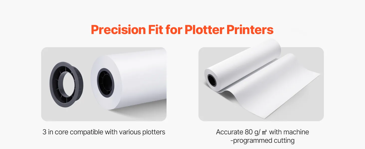 Precise Weight Control: Our plotter paper uses new machine-programmed length calculations, offering greater precision than older cutting methods. An 80 g/m² weight and accurate length ensure compatibility with printer size specifications for smooth paper feeding and fewer jams.