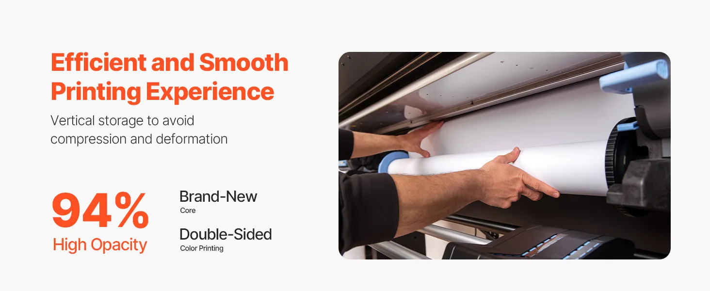 High-Speed Printing: This plotter paper roll is packaged vertically to reduce installation challenges and avoid core deformation, minimizing jamming issues. Constructed with new materials, it offers up to 94% opacity, enabling double-sided color printing and drawing with no bleed-through for efficient operations.