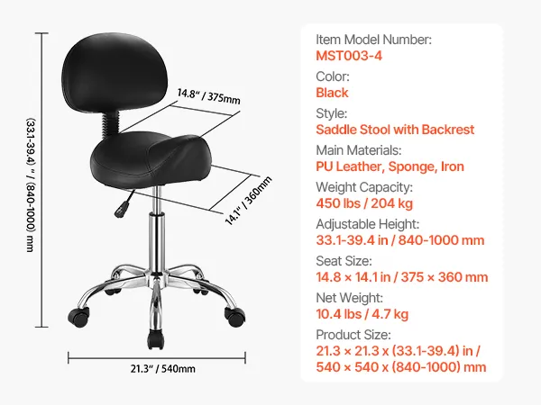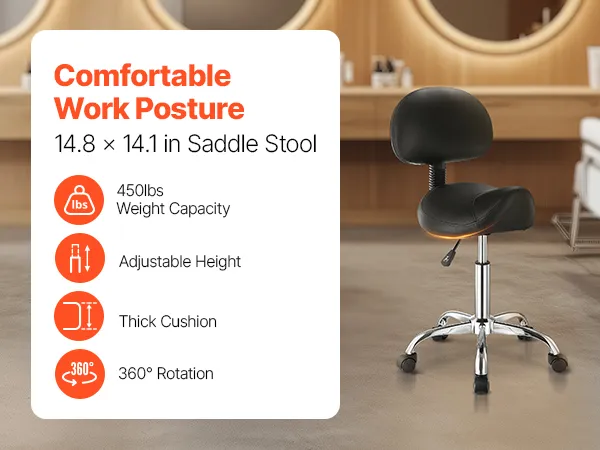 This saddle stool helps relieve tension in the back and hips, featuring an oversized, thickened cushion that supports up to 450lbs. The adjustable seat height and 360° swivel mobility ensure convenience and efficiency during work.