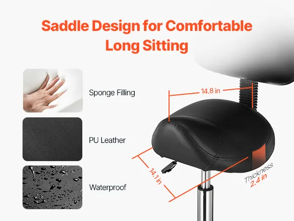 Our rolling stool is made of high-density compressed foam. The cushion measures 14.8 x14.1 in with a thickness of 2.4 in, and the leather seat is waterproof and breathable, providing extra comfort for long periods of sitting.