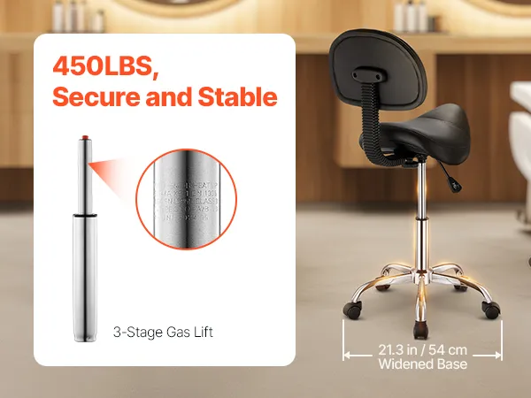 450 lbs Weight Capacity: Our office stool base is widened to 21.3 in / 54.9 cm, with a sturdy metal structure that supports up to 450 lbs. Rest assured, we use an SGS-certified three-stage hydraulic gas lift, so you won't have to worry about metal bending. You can confidently rely on the durability of this chair.