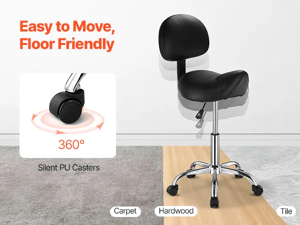 Silent PU Wheels: Equipped with five 360° rotating PU wheels, this adjustable stool moves smoothly and quietly within the workspace without generating any irritating noise from friction. The wheels leave no unsightly marks on the floor and are suitable for various surfaces, including carpet, tiles, and hardwood.