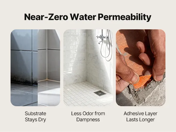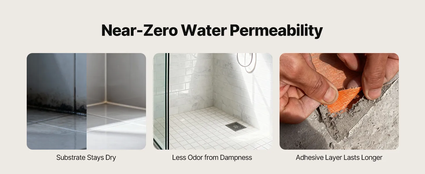 Sturdy and Tear-Resistant: This bathroom membrane remains flexible and flat under steam and temperature changes. Tear-resistant, it avoids bubbling or edge lifting, reduces thermal expansion deformation, and ensures long-lasting and reliable waterproofing