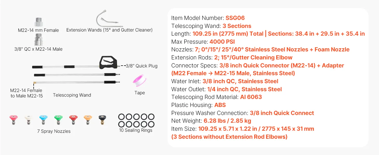 VEVOR 2.74 m Pressure Washer Telescoping Wand, 3-Section with Power Washer Extension Wands, 7 Nozzles, Hose Adapter, Support Belt, Storage Bag, 4000 PSI Telescopic Gutter Cleaner for High Cleaning