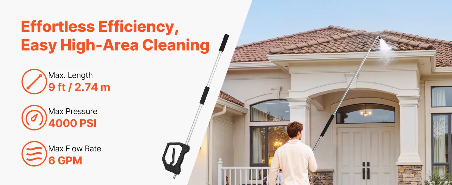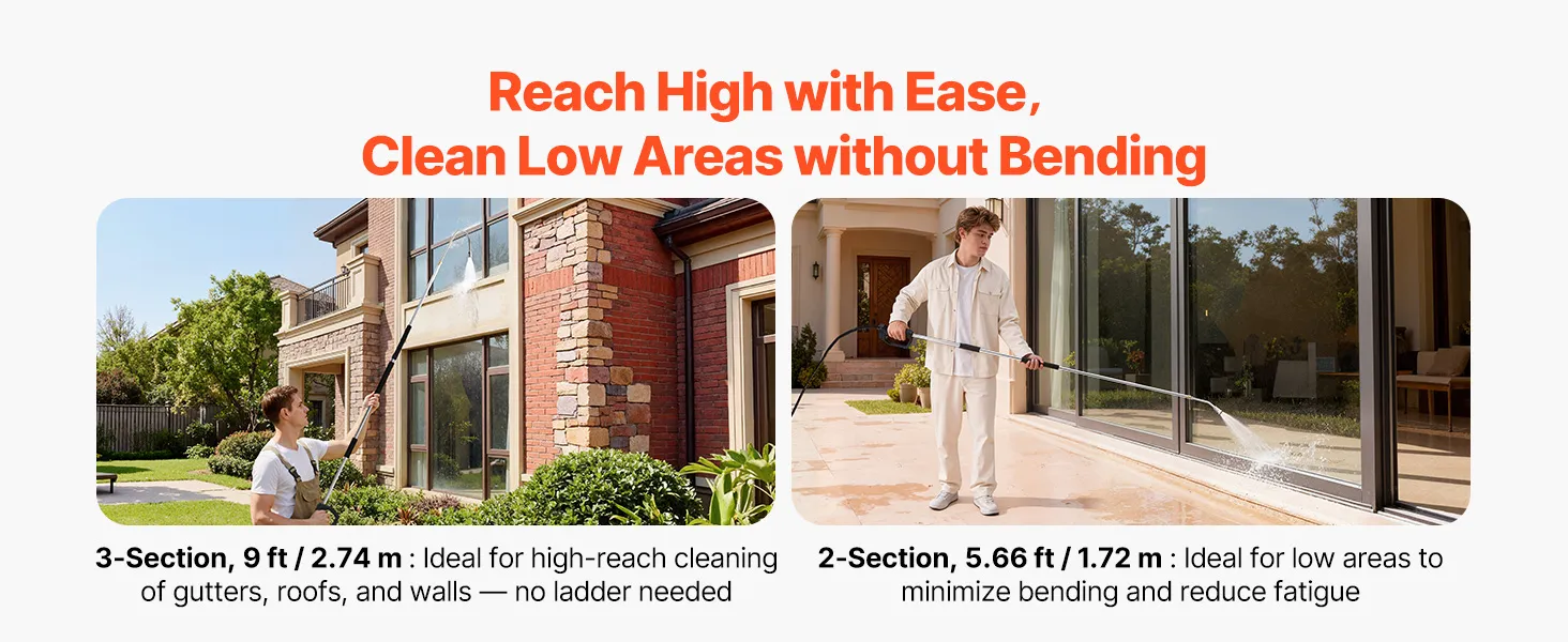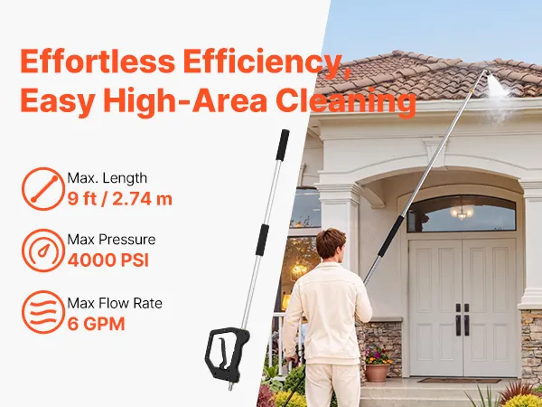 Effortless High Cleaning: This pressure washer extension pole features a 3-section design that extends up to 9 ft / 2.74 m, letting you clean high areas safely without using a ladder, ideal for roofs, gutters, and elevated exterior surfaces