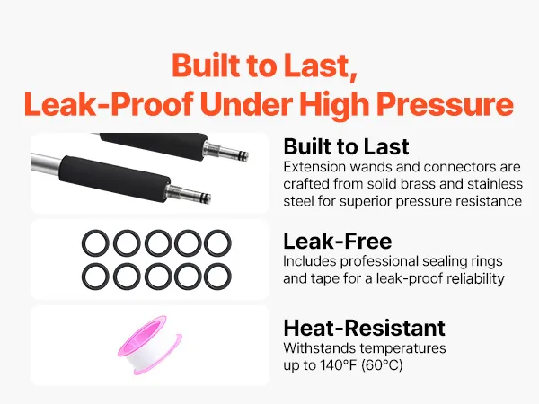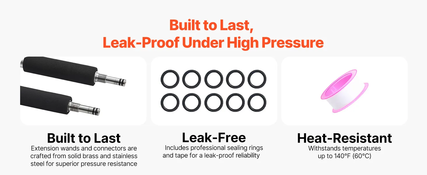 Leak-Free Performance: Built as a power washer extension wand, the extension sections and connectors use solid brass and stainless steel for reliable pressure handling. Professional sealing rings and tape help maintain tight connections during use