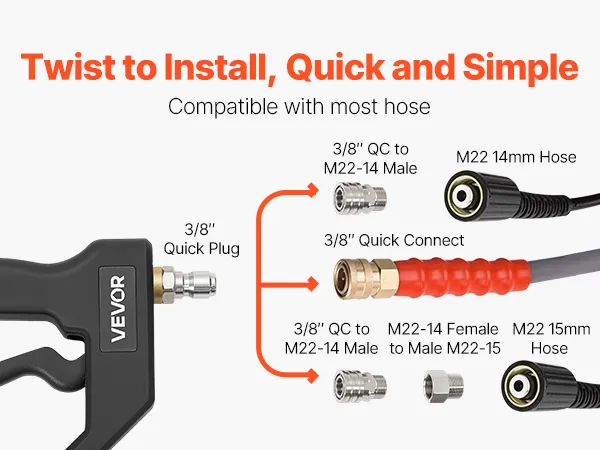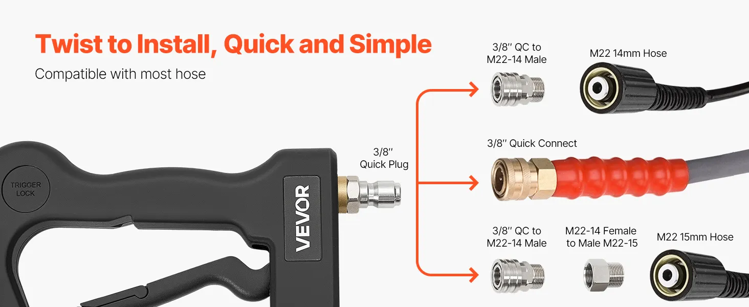 This power wash extension wand installs easily with a twist-and-connect design. Two included adapters provide compatibility with many pressure washer hoses, allowing quick setup without tools.