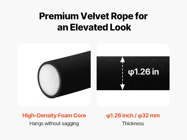 Thick, Resilient Core: This velvet rope barrier is built with a dense foam core that provides shape and resilience, allowing it to hang smoothly without collapsing or flattening