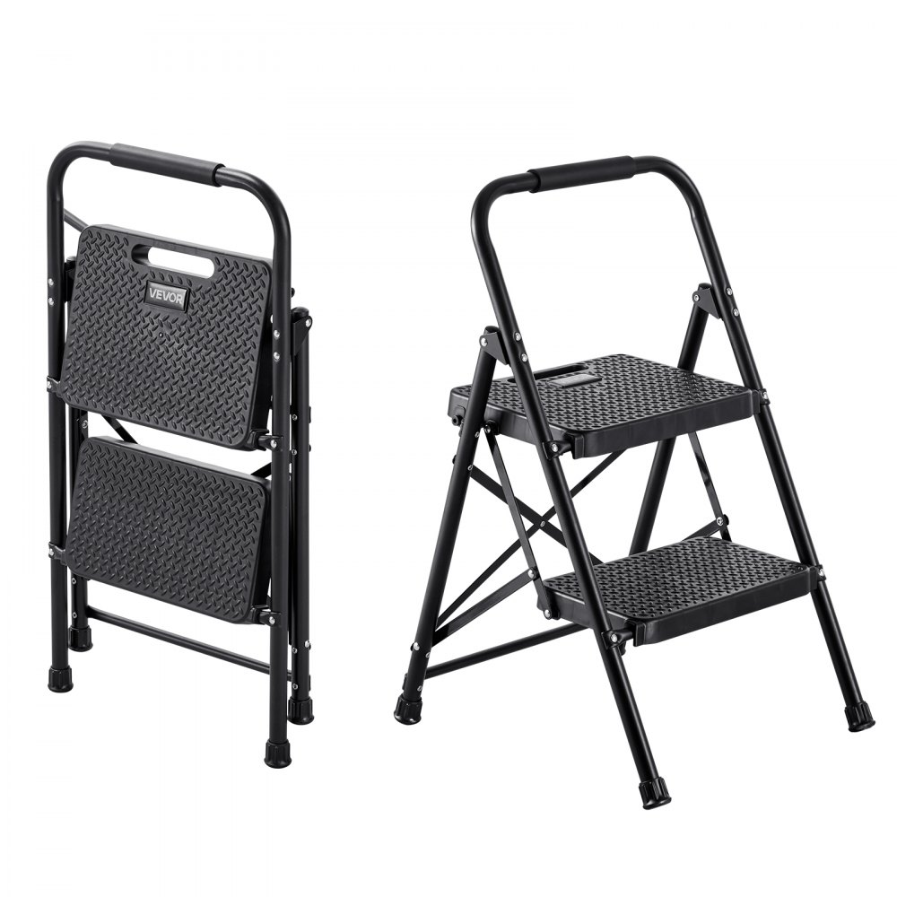 VEVOR 2 Step Ladder, Folding Step Stool with Wide Anti-Slip Pedal and Comfort Handgrip, Lightweight 272 kg Capacity Portable Steel Ladder, Multi-Use for Kitchen, Home, Household and Office, Black VEVOR 2 Step Ladder, Folding Step Stool with Wide Anti-Slip Pedal and Comfort Handgrip, Lightweight 272 kg Capacity Portable Steel Ladder, Multi-Use for Kitchen, Home, Household and Office, Black