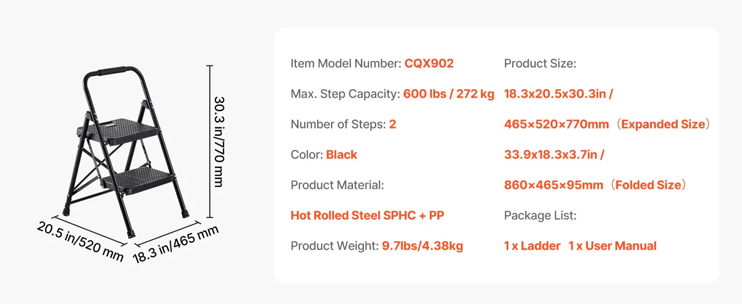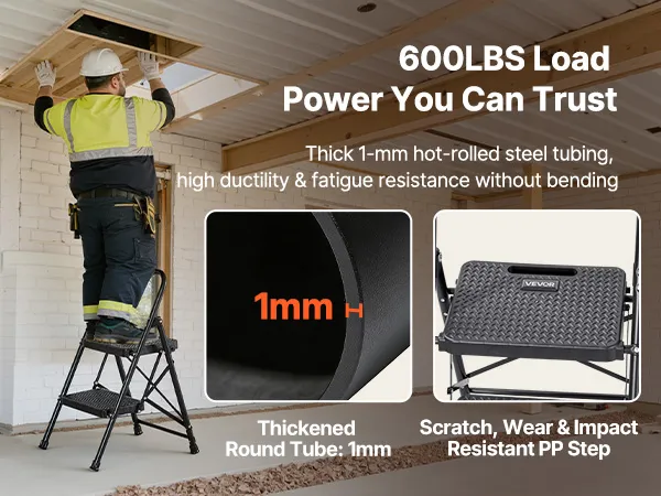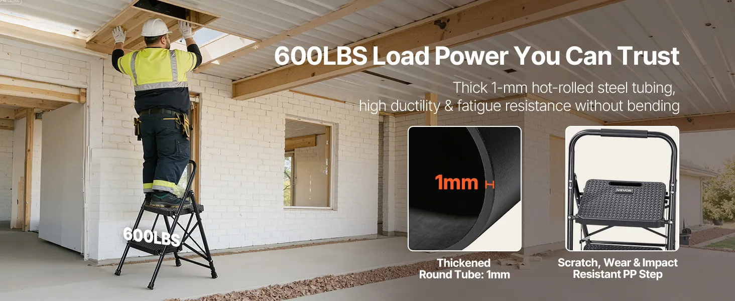600 lbs Load Capacity: Built from 1-mm thick hot-rolled steel round tubing and finished with rust- and damp-resistant powder coating, the folding step ladder delivers rock-solid 600 lbs max. support, lasting bend resistance and stability over time