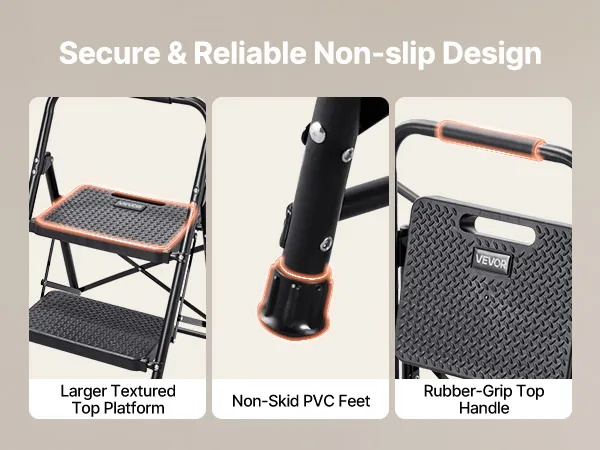 Security & Stability: Enlarged textured top step provides steady footing. Wide PVC coated feet help reduce floor marks and unwanted movement. Rubber padded top handrail offers comfortable secure support for confident everyday use