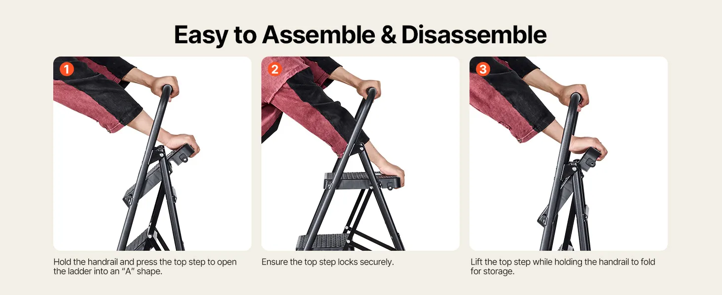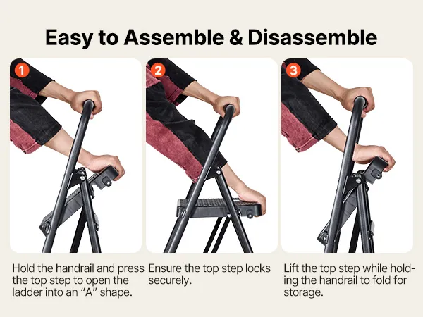 This foldable step ladder opens easily with a one-hand press-to-lock top step with smooth and hassle-free operation, no complicated setup, folds slim for storage when not in use, great for everyday homes.