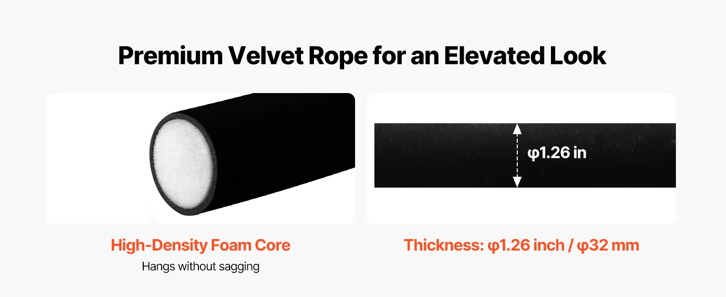 Thick, Resilient Core: This velvet rope barrier is built with a dense foam core that provides shape and resilience, allowing it to hang smoothly without collapsing or flattening