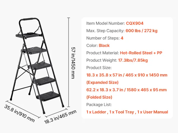 Full-Height 4-Step Elevation: 18.3 x 35.8 x 57 in expanded size delivers tall, stable elevation coverage for cupboard, attic and décor tasks without unsafe tiptoe stretching and 62.2 x 18.3 x 3.7 in folded size for convenient storage and space-saving