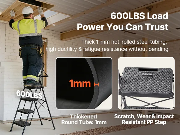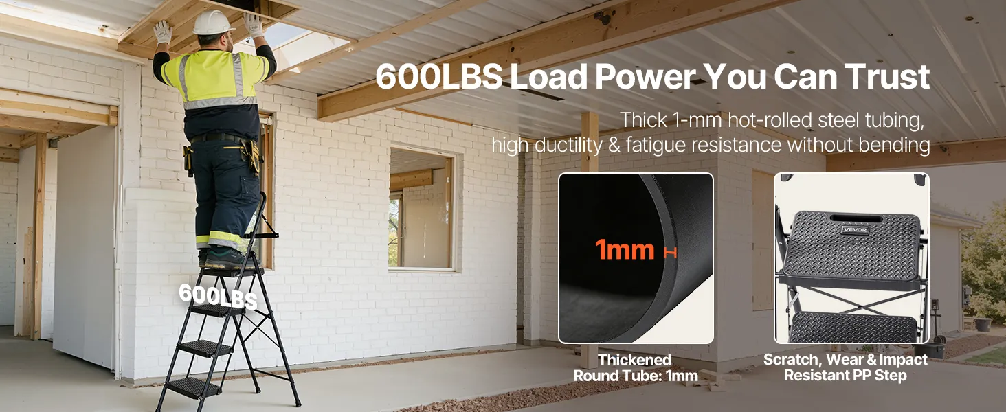 600 lbs Load Capacity: Built from 1-mm thick hot-rolled steel round tubing and finished with rust- and damp-resistant powder coating, the folding step ladder delivers rock-solid 600 lbs max. support, lasting bend resistance and stability over time