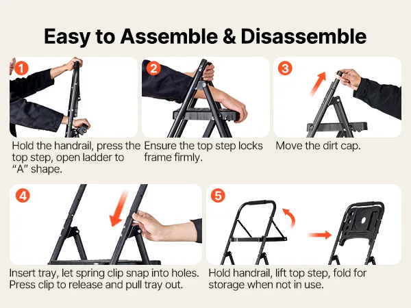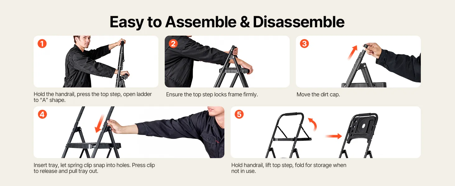 This foldable step ladder opens easily with a one-hand press-to-lock top step with smooth and hassle-free operation, no complicated setup, folds slim for storage when not in use, great for everyday homes.