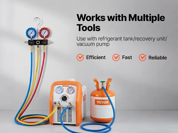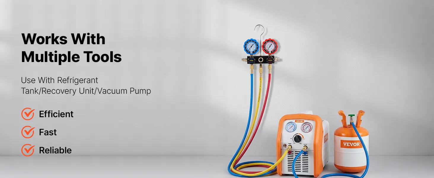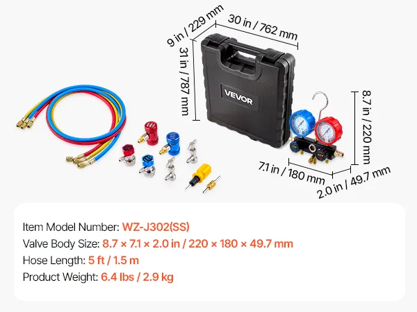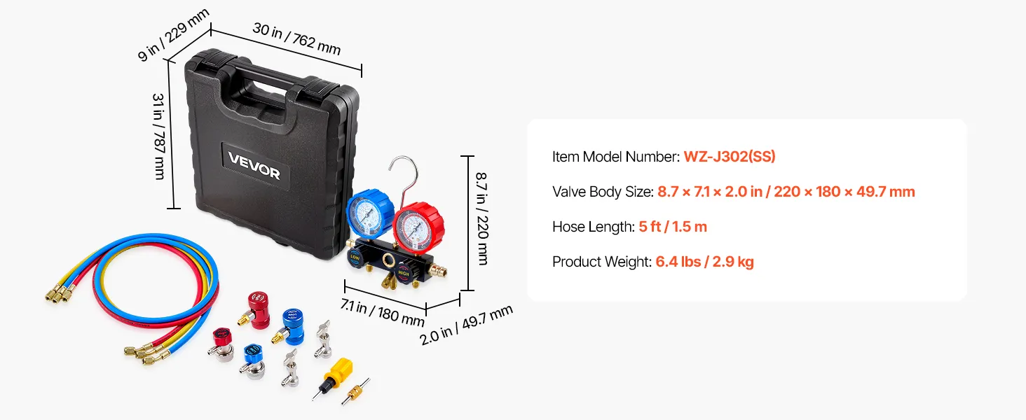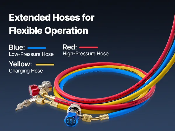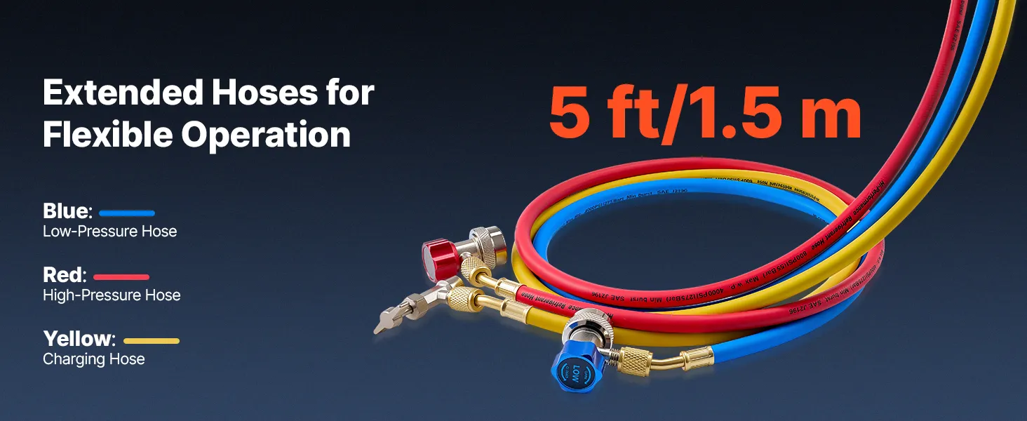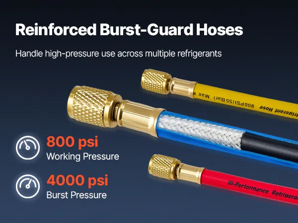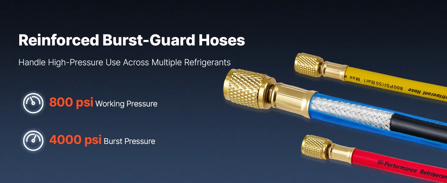 High-Pressure Sealing Hoses: Designed to pair with the AC gauge set, the three 5 ft heavy-duty rubber hoses are rated for 800-4000 PSI working pressure. Gasketed fittings and brass connectors help reduce leakage and avoid loosening during service