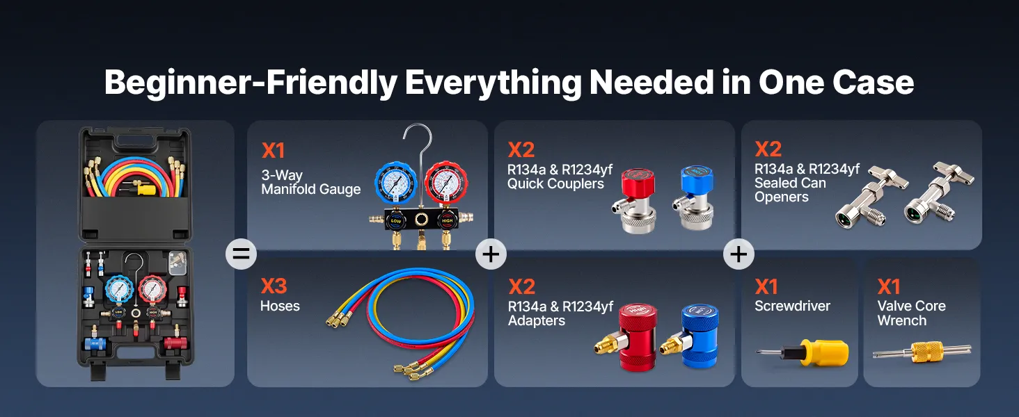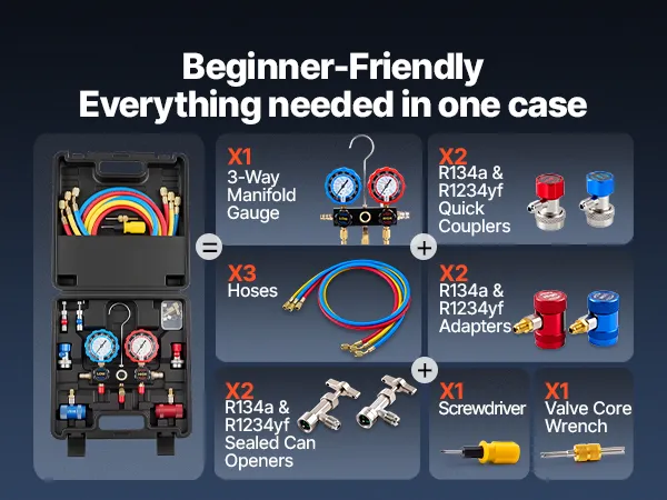 Complete Manifold Gauge Set: This complete kit includes a 3-way manifold gauge, 3 color-coded hoses, R134a/R1234yf quick couplers, sealed can taps, adapters, a screwdriver, and a valve core wrench. All packed in a carry case for easy transport and storage