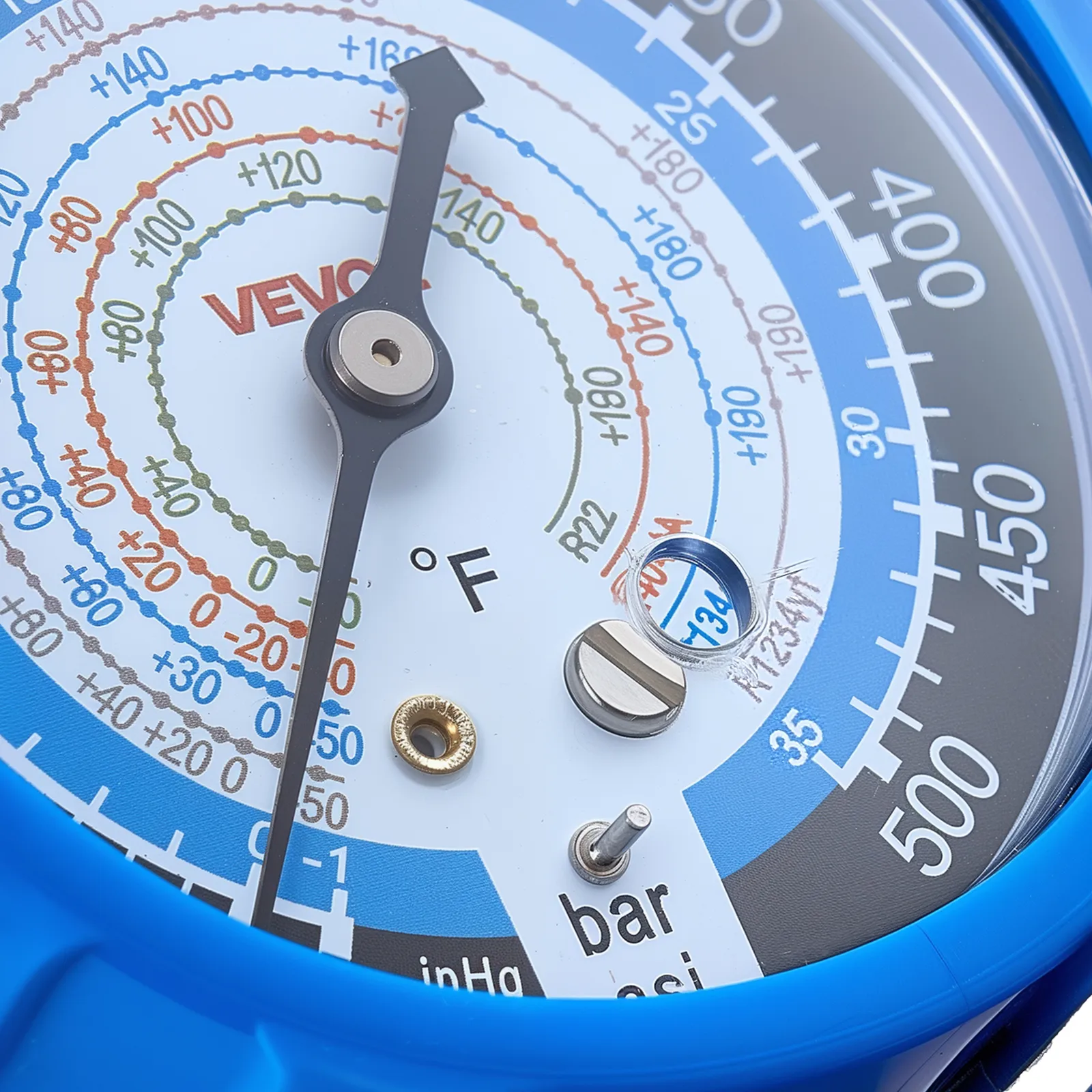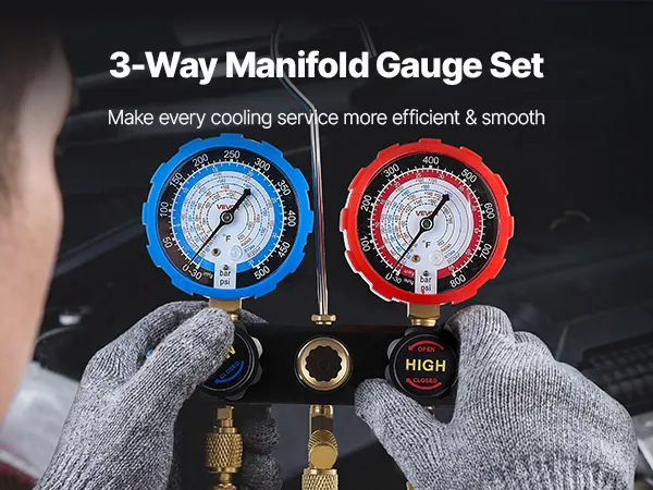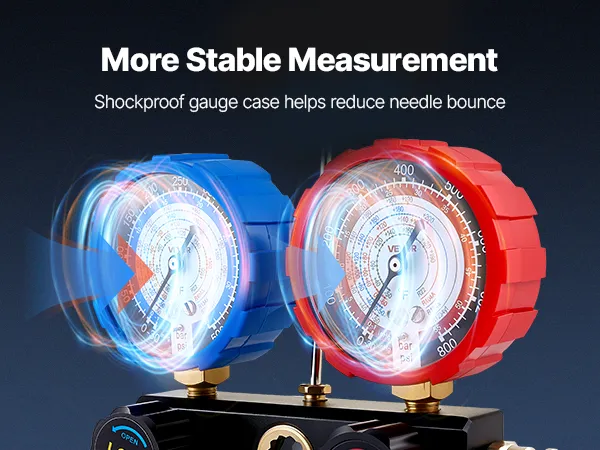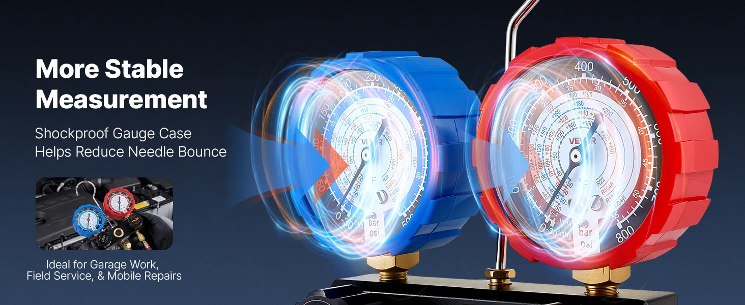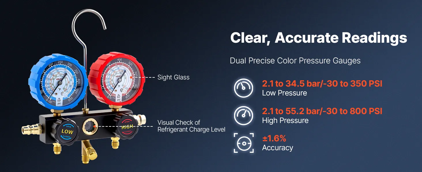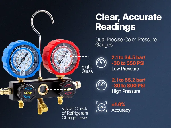 Clear Dual-Scale Gauges: The AC manifold gauge features color-coded high- and low-pressure dials for easy reading. Calibration screws maintain ±1.6% accuracy, while Fahrenheit temperature scales and a sight window help assess charge level during testing