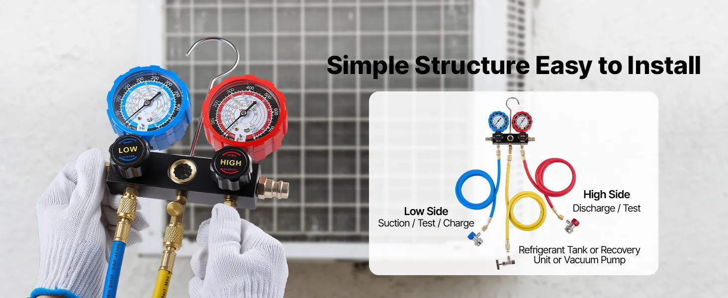 Durable Metal Construction: The AC manifold gauge set uses solid brass fittings and an aluminum valve body for strength and reliable sealing. Each component is tested for repeated operation in both workshop and on-site service environments