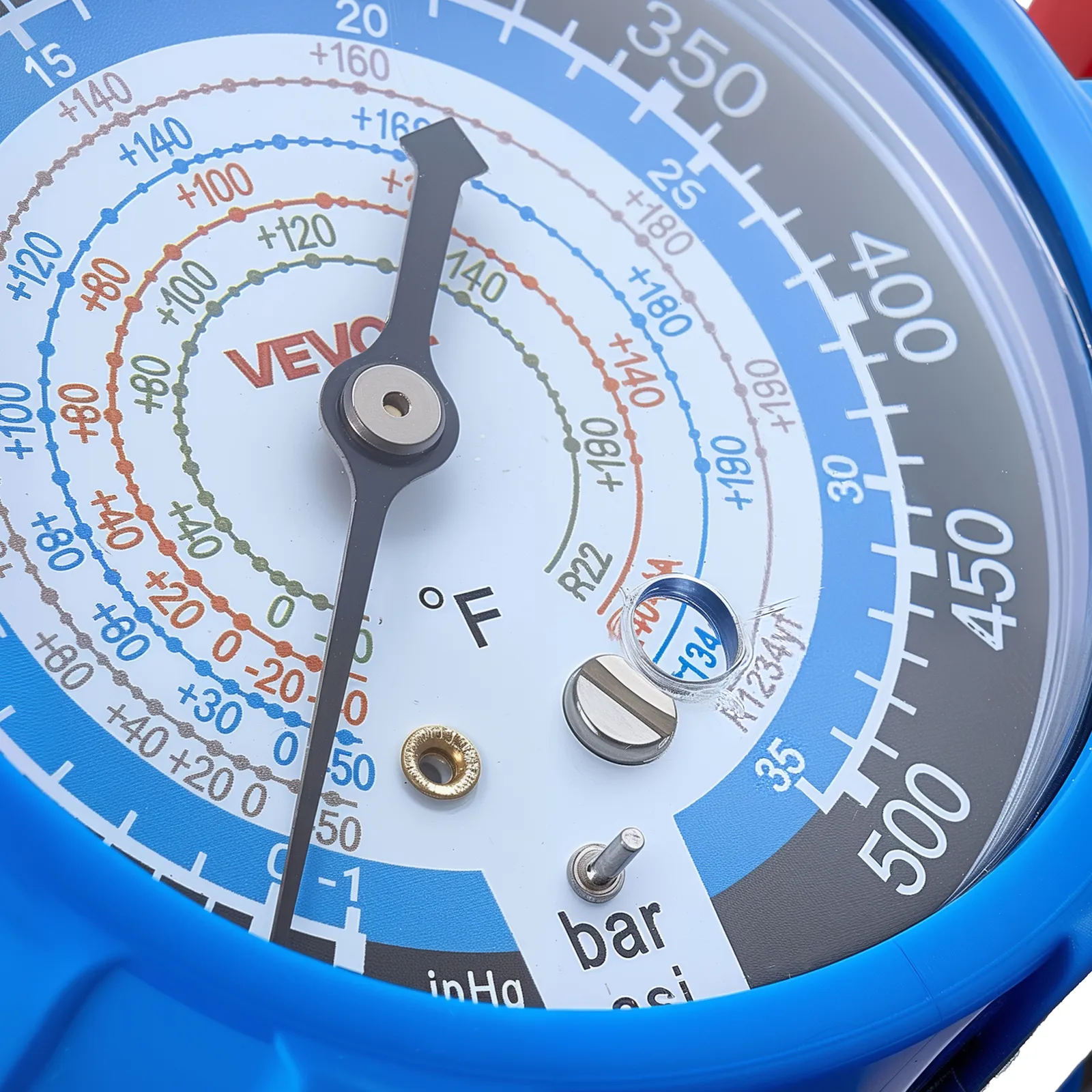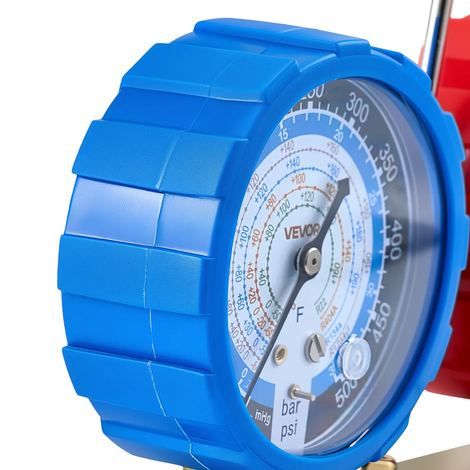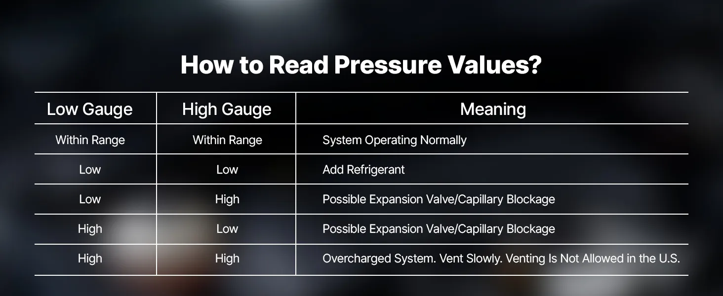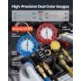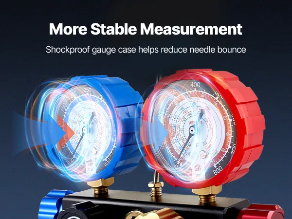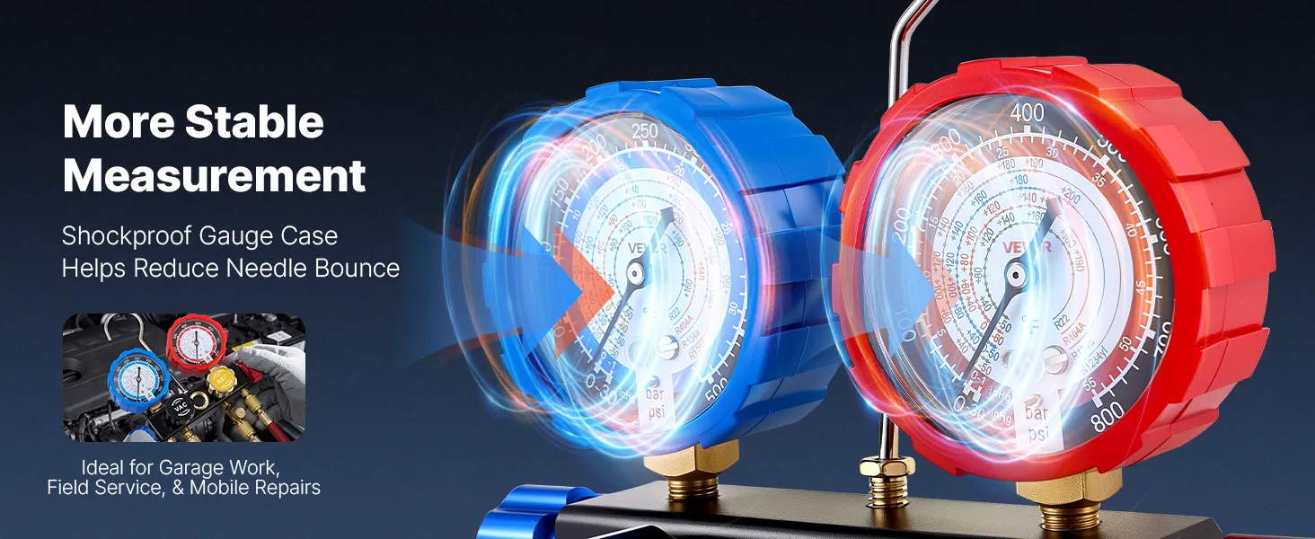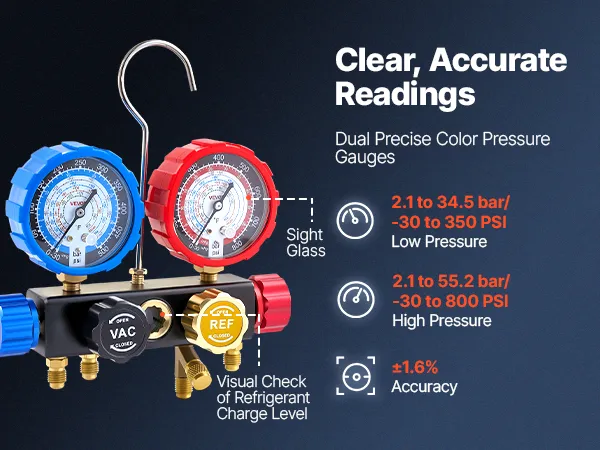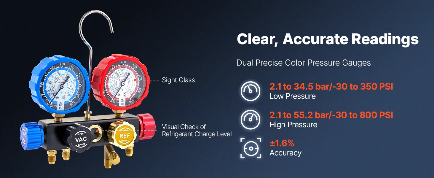Clear Dual-Scale Gauges: The AC manifold gauge features color-coded high- and low-pressure dials for easy reading. Calibration screws maintain ±1.6% accuracy, while Fahrenheit temperature scales and a sight window help assess charge level during testing