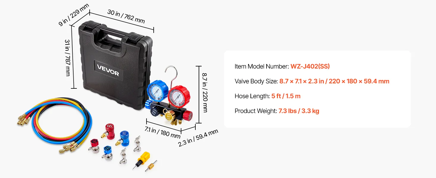 Our manifold gauge set combines professional four-valve control with integrated portability. It supports precise, independent operation on complex systems while keeping all components protected and organized in a rugged carry case for field service.