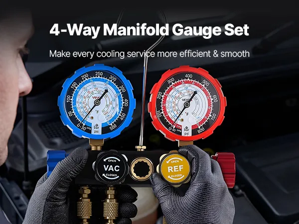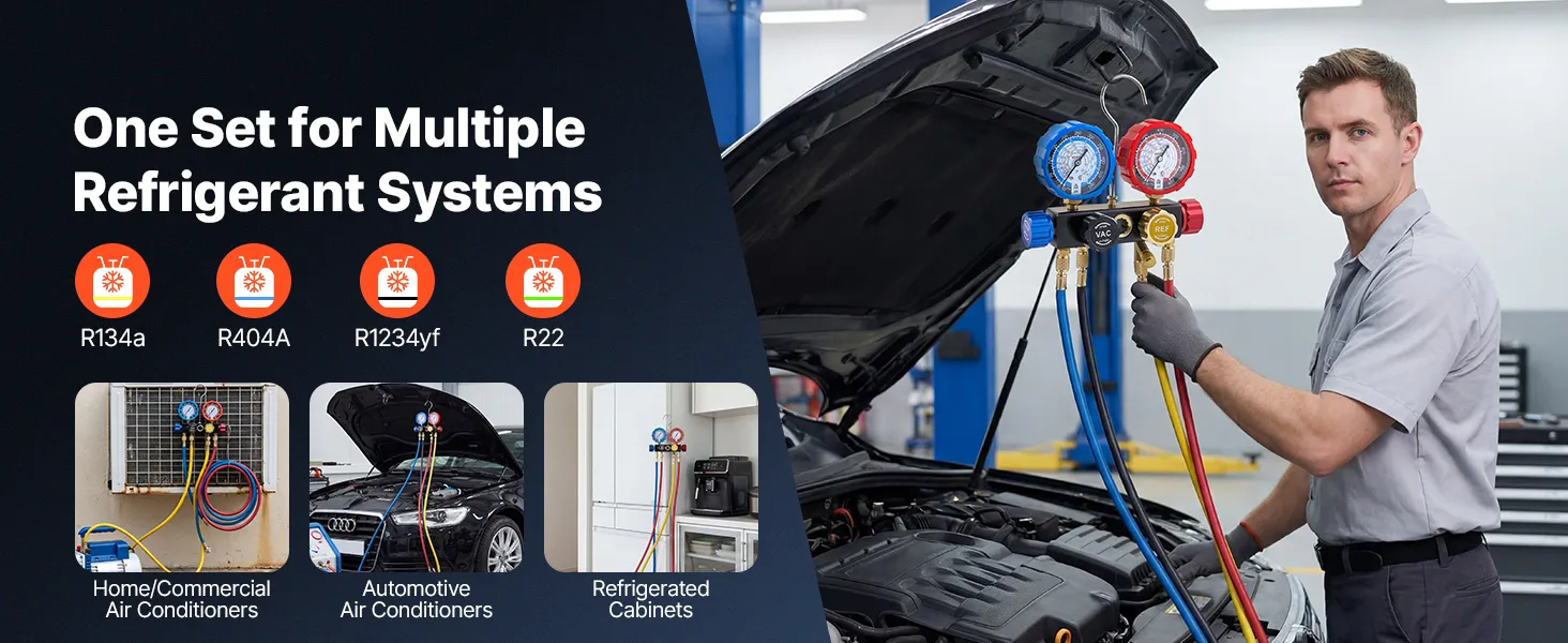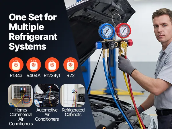 Works with Four Refrigerants: This 4-way AC gauge accurately measures pressure for R134a, R404A, R1234yf, and R22. It is a versatile solution for automotive AC systems, household refrigerators, and small-scale refrigeration equipment