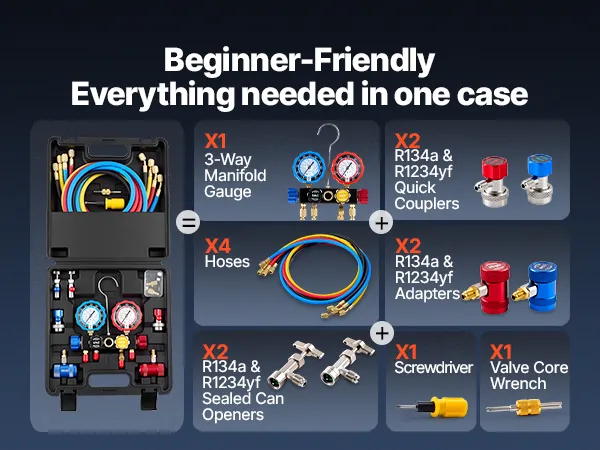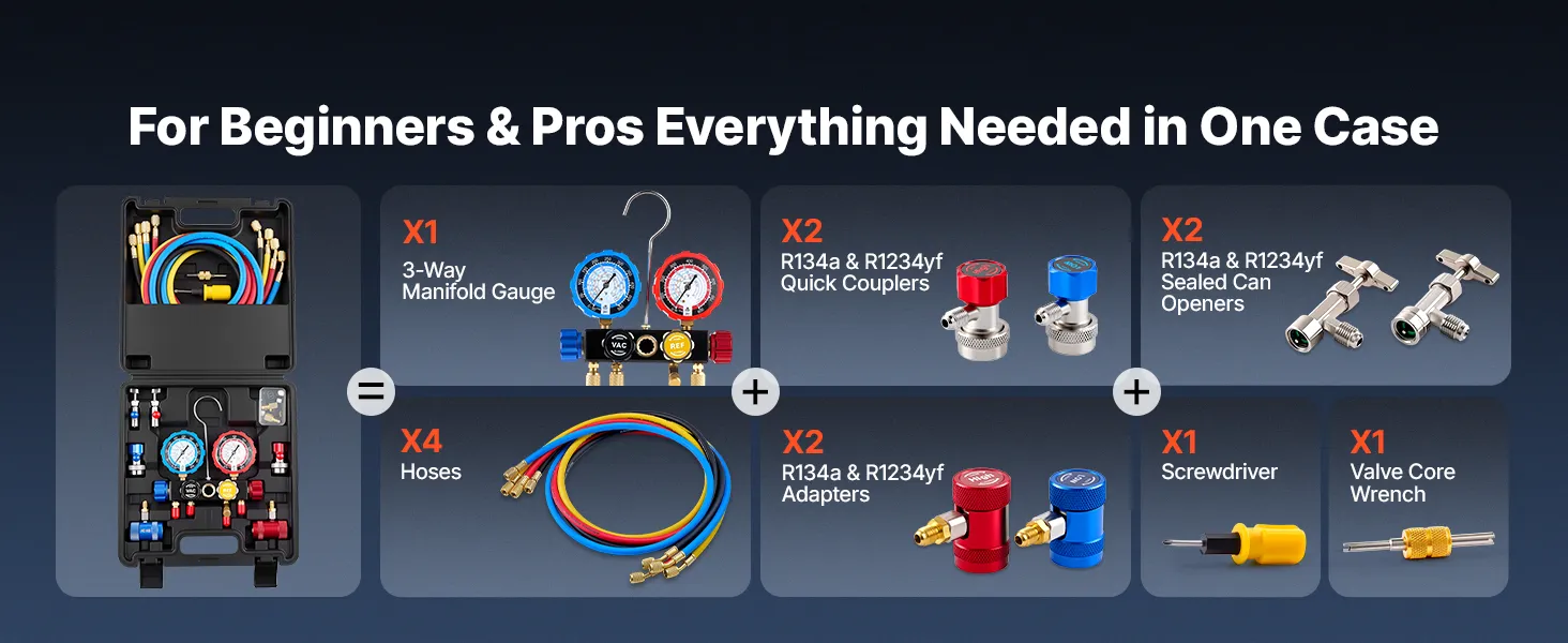 Complete Manifold Gauge Set: This complete kit includes a 4-way manifold gauge, 4 color-coded hoses, R134a/R1234yf quick couplers, sealed can taps, adapters, a screwdriver, and a valve core wrench. All packed in a carry case for easy transport and storage