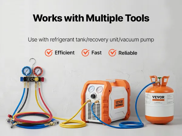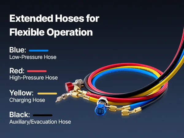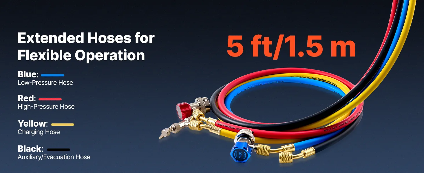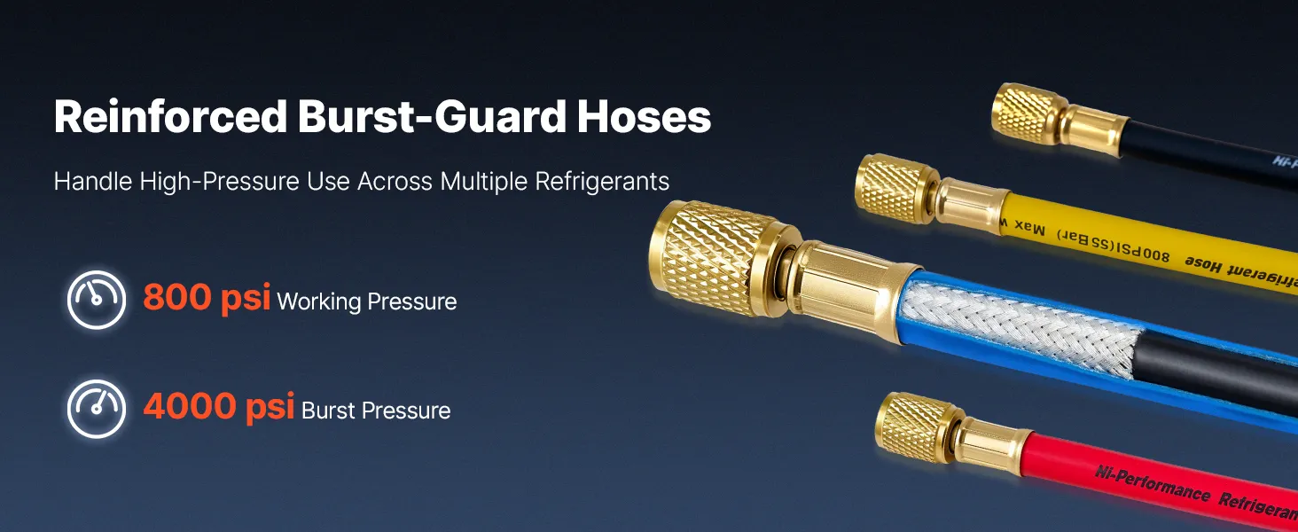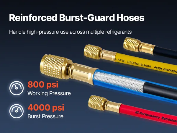 High-Pressure Sealing Hoses: Designed to pair with the AC gauge set, the four 5 ft heavy-duty rubber hoses are rated for 800-4000 PSI working pressure. Gasketed fittings and brass connectors help reduce leakage and avoid loosening during service