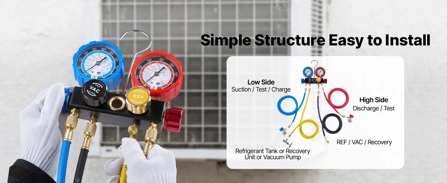 Durable Metal Construction: The AC manifold gauge set uses solid brass fittings and an aluminum valve body for strength and reliable sealing. Each component is tested for repeated operation in both workshop and on-site service environments