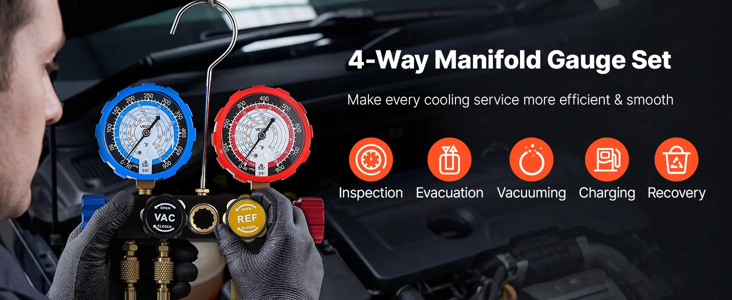 VEVOR AC Manifold Gauge Set for R134a R404A R1234yf R22 Refrigerant, 4 Way AC Gauge with 1.5m Hoses, Adapters, Quick Couplers, Can Taps for Automotive Air Conditioning Maintenance, Charging Evacuation