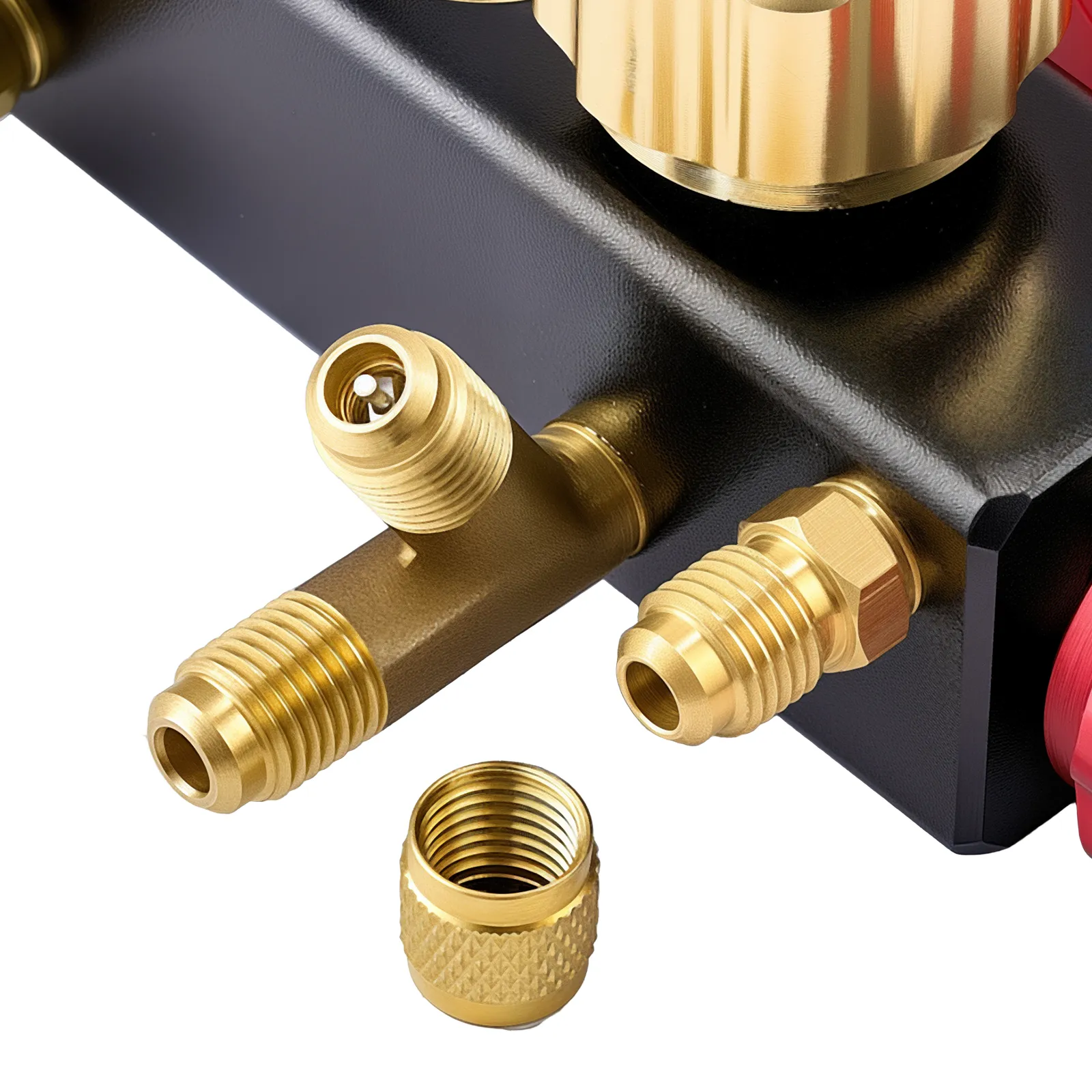 This AC manifold gauge features solid brass fittings, ensuring a durable, leak-free connection under high pressure.