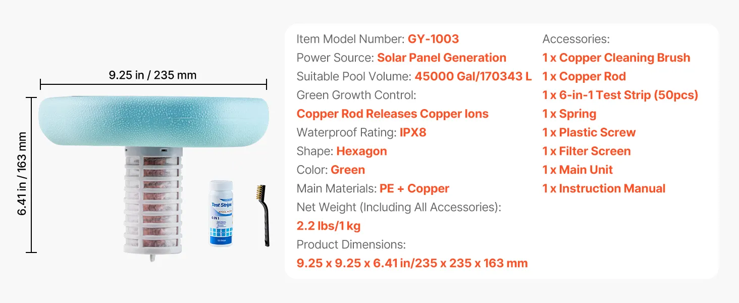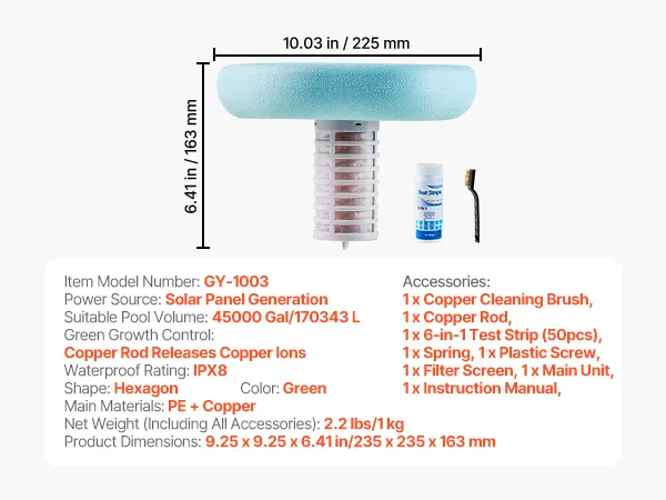 Complete Kit: Everything you need is included: the main unit, copper rod, copper cleaning brush, spring, screws, filter screen, and a user manual. Our solar copper pool ionizer provides 50 6-in-1 test strips to monitor water balance and copper ion levels