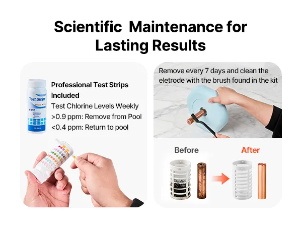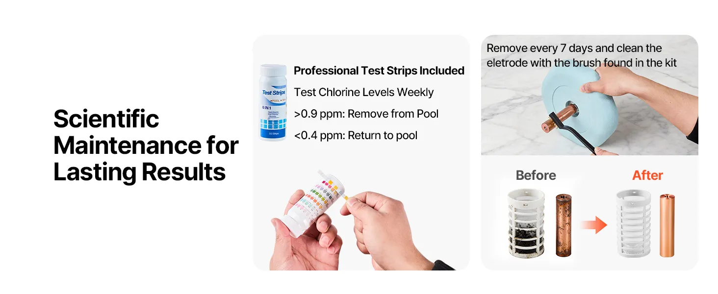 When copper ion levels are kept at 0.5-0.9 ppm, they can effectively control green growth while preserving water clarity. This copper ionizer for pool includes 50 professional test strips for accurate monitoring. Simply use the included brush to clean the copper rod to ensure efficient ion release.