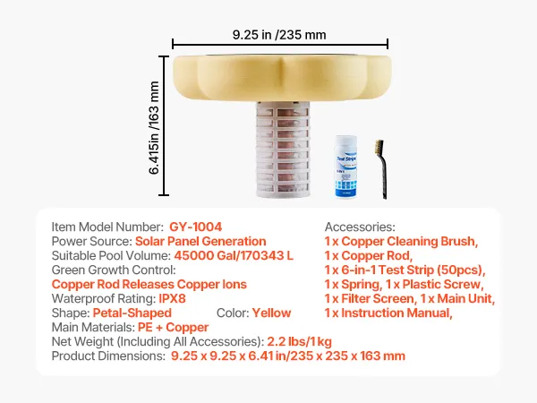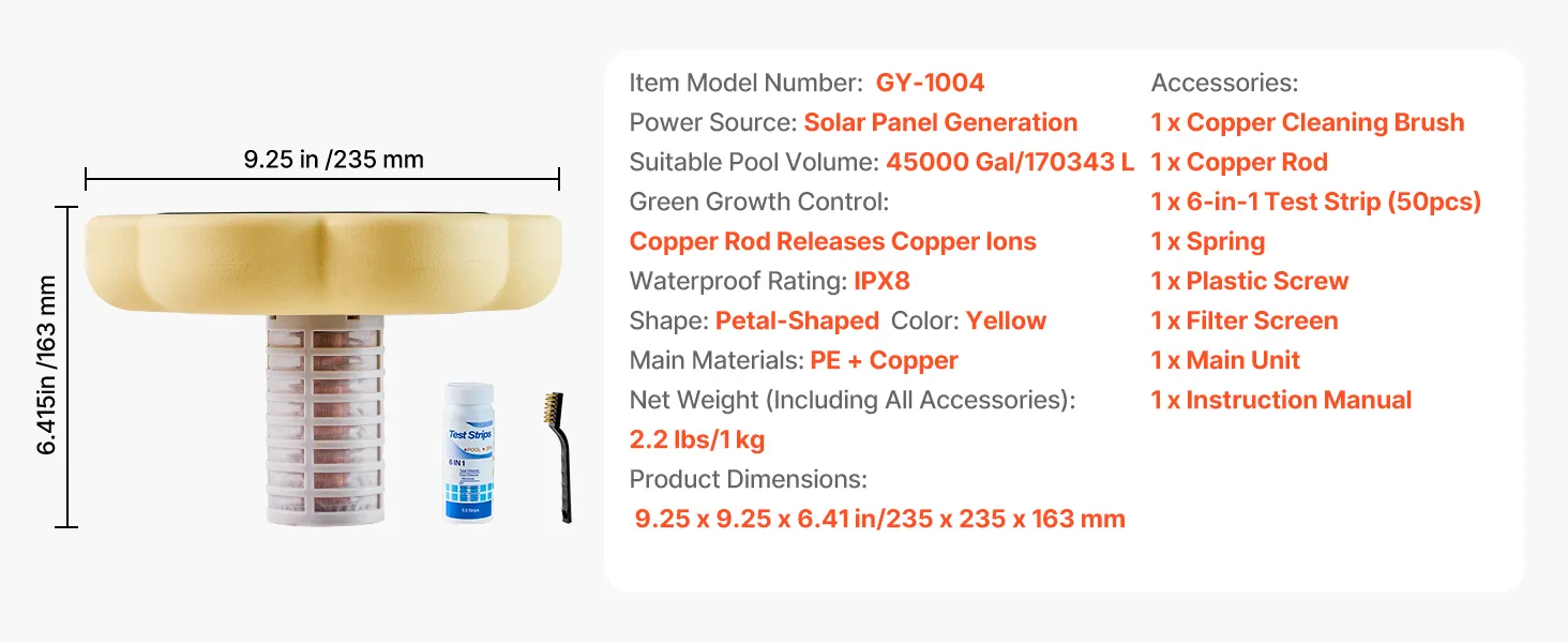 Complete Kit: Everything you need is included: the main unit, copper rod, copper cleaning brush, spring, screws, filter screen, and a user manual. Our solar copper pool ionizer provides 50 6-in-1 test strips to monitor water balance and copper ion levels