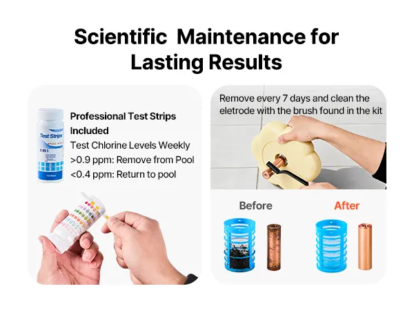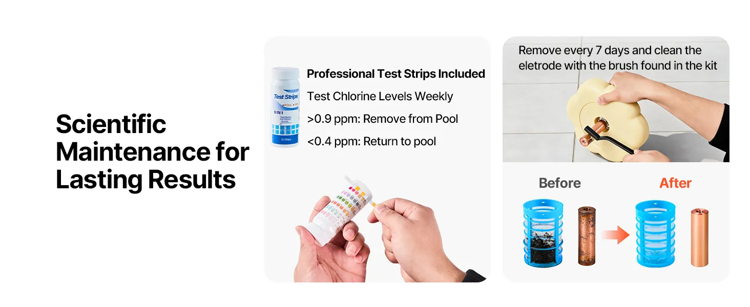 When copper ion levels are kept at 0.5-0.9 ppm, they can effectively control green growth while preserving water clarity. This copper ionizer for pool includes 50 professional test strips for accurate monitoring. Simply use the included brush to clean the copper rod to ensure efficient ion release.