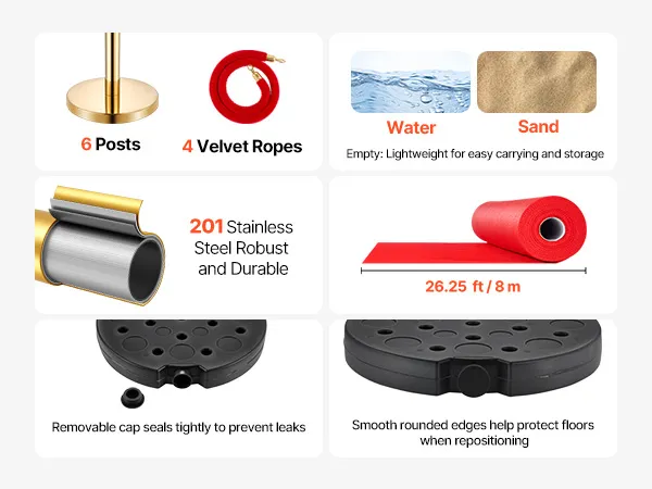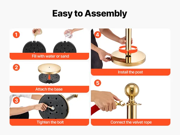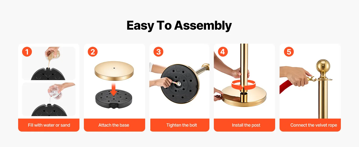 Quick Assembly: No tools required! Simply fill this stanchion posts queue with sand/water and screw the base into place, and your velvet ropes and stands is ready to go. Easy to set up and even easier to use whenever you need it