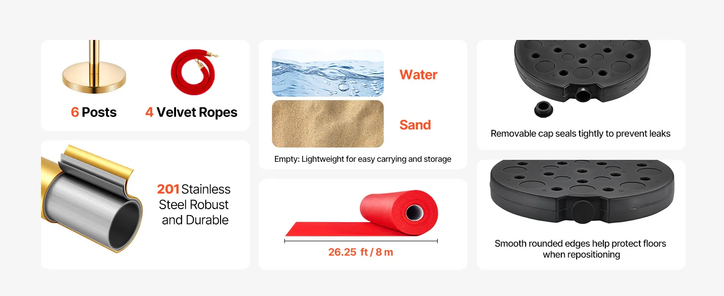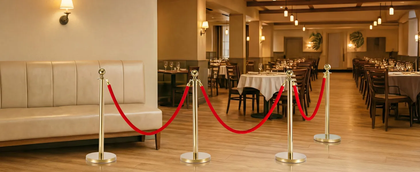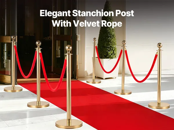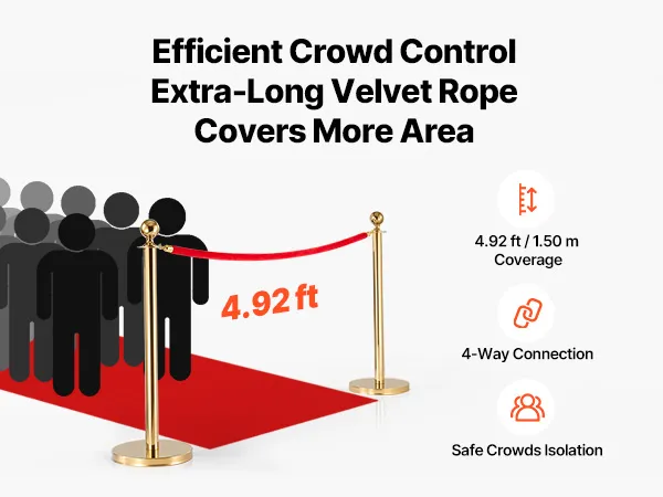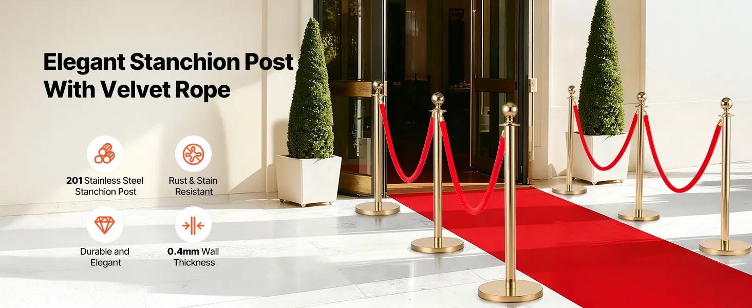 Premium Velvet Rope Stanchions: Built with sturdy 201 stainless steel posts, our stanchion post with thick velvet ropes and a refined metal finish to ensure reliable crowd guidance while instantly elevating your entrance with a high-end ceremonial look