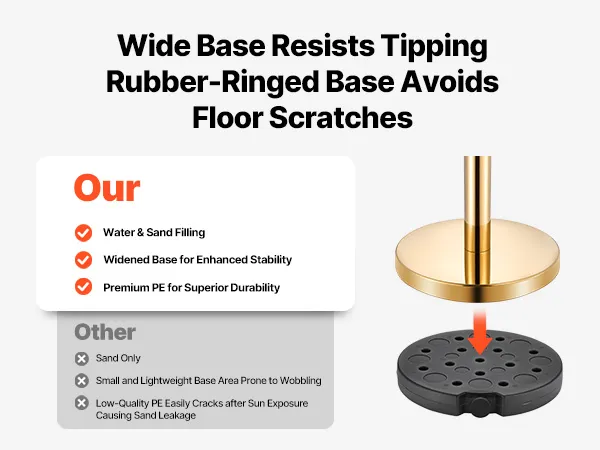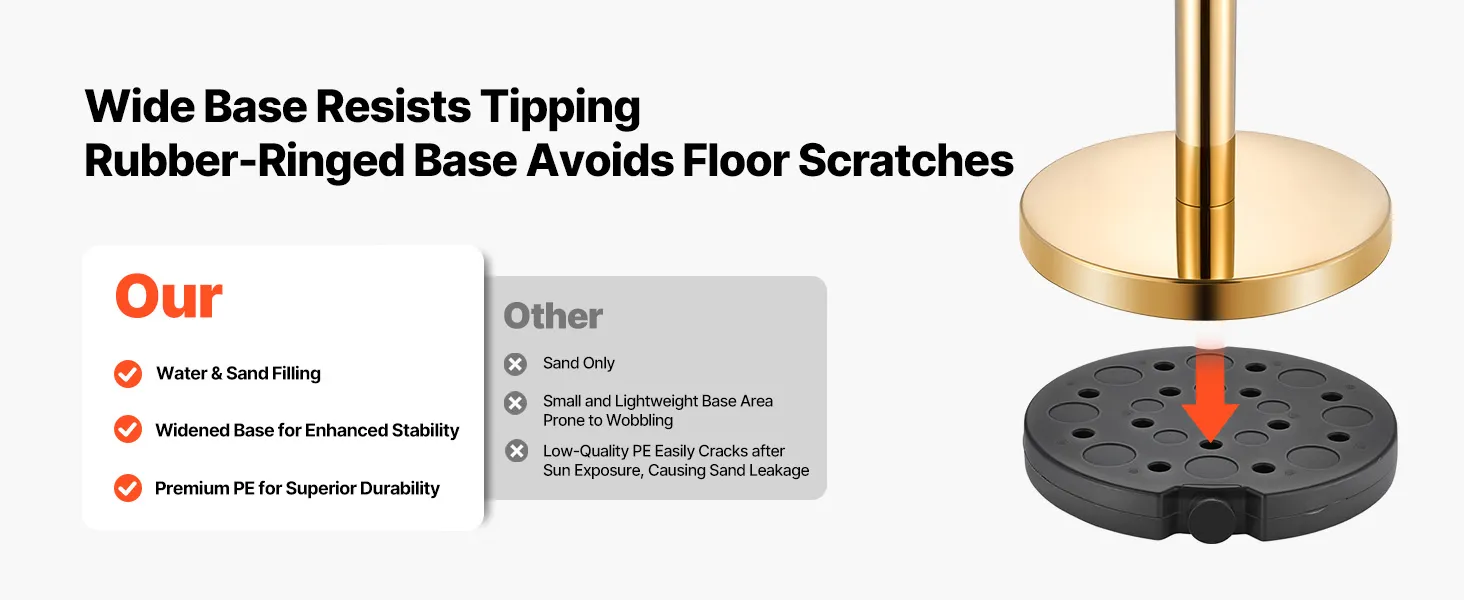 Fillable and Floor-Friendly Base: Fill each base with water or sand (up to 5.73 lbs / 2.6 kg, 7.72 lbs / 3.5 kg) and rely on the rubber ring to resist tipping while protecting floors