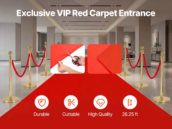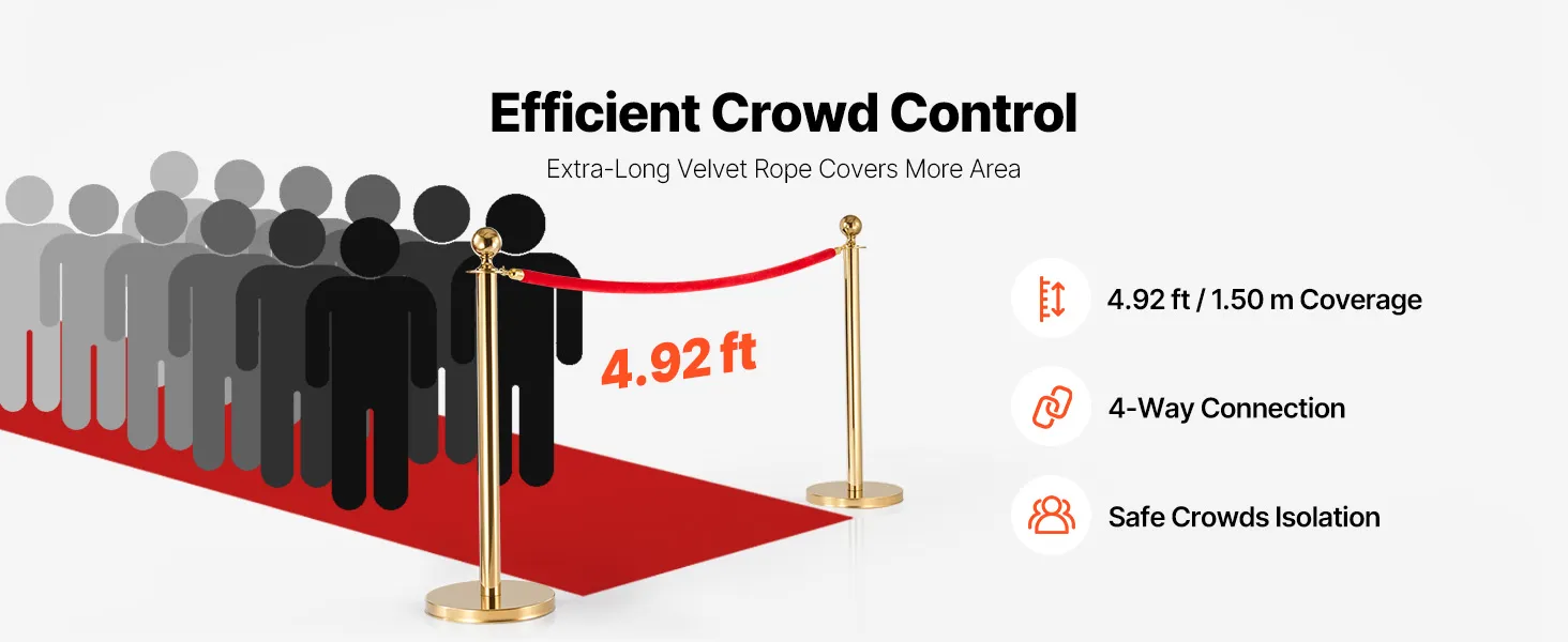 VIP Entry Path: The 4-way rope adapter allows flexible connection of multiple velvet ropes, while the trimmable red carpet with included double-sided tape makes the crowd control barrier easy to create an elegant and organized entrance with one complete set