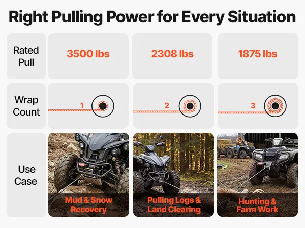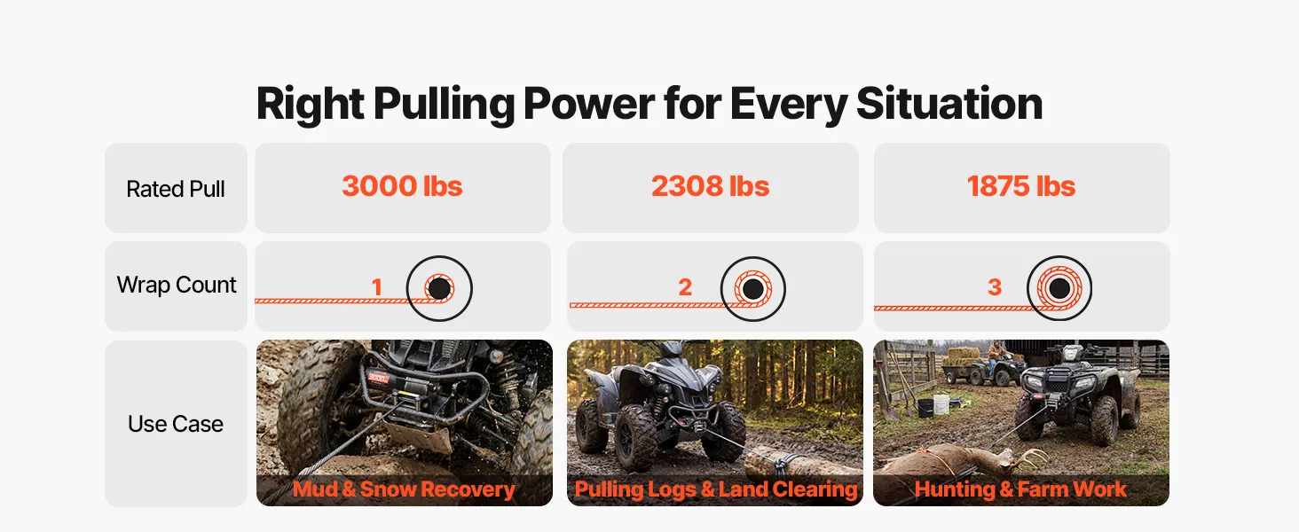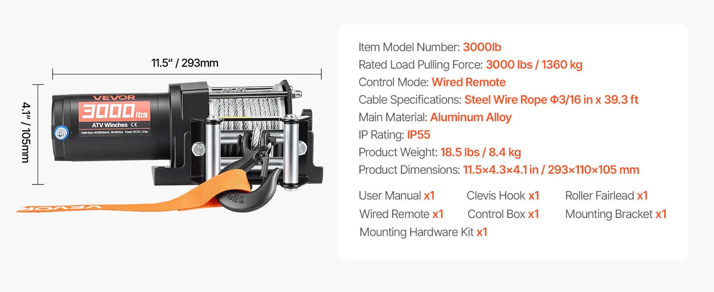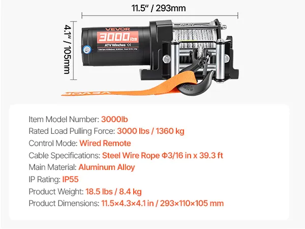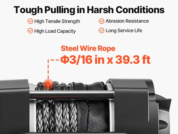 Reliable Pulling Strength: Constructed with a multi-strand steel wire rope, measuring 3/16 in in diameter and 39.4 ft in length. Built for high tensile strength, the ATV winch delivers dependable load support and long-lasting durability