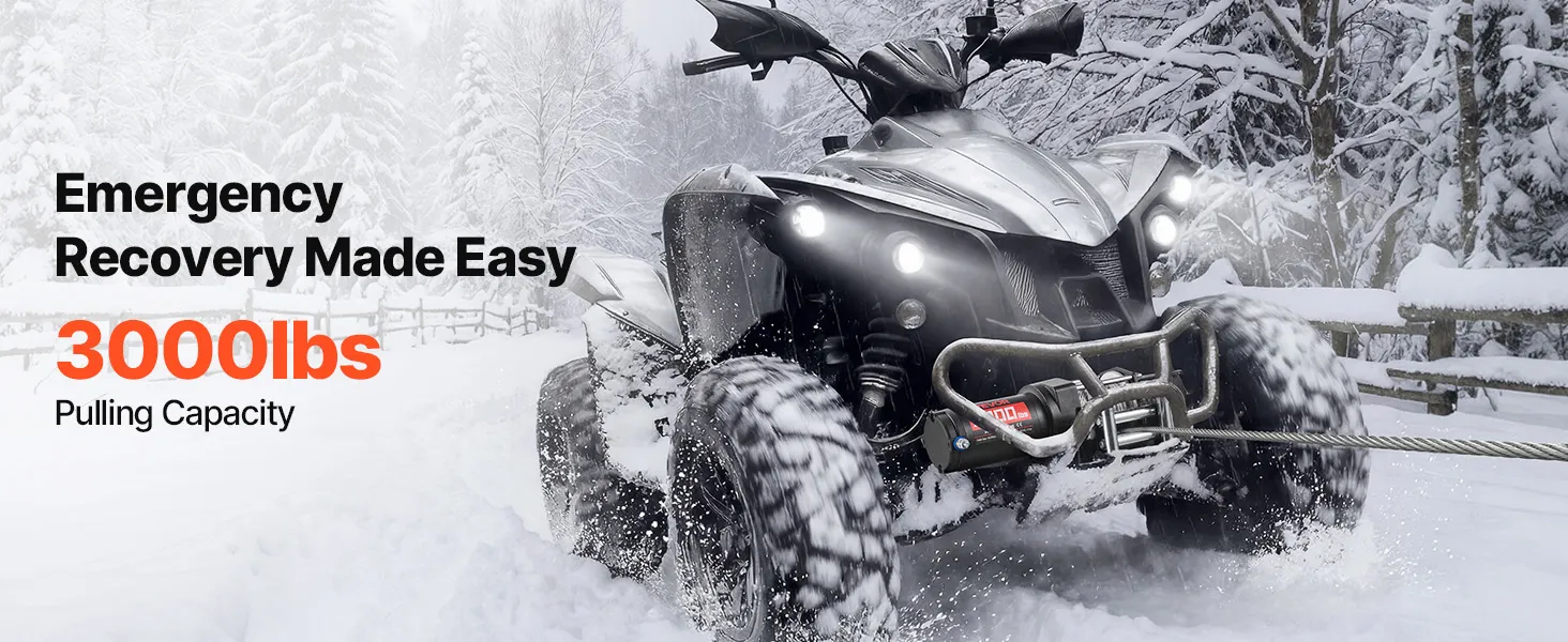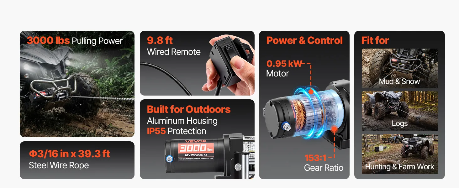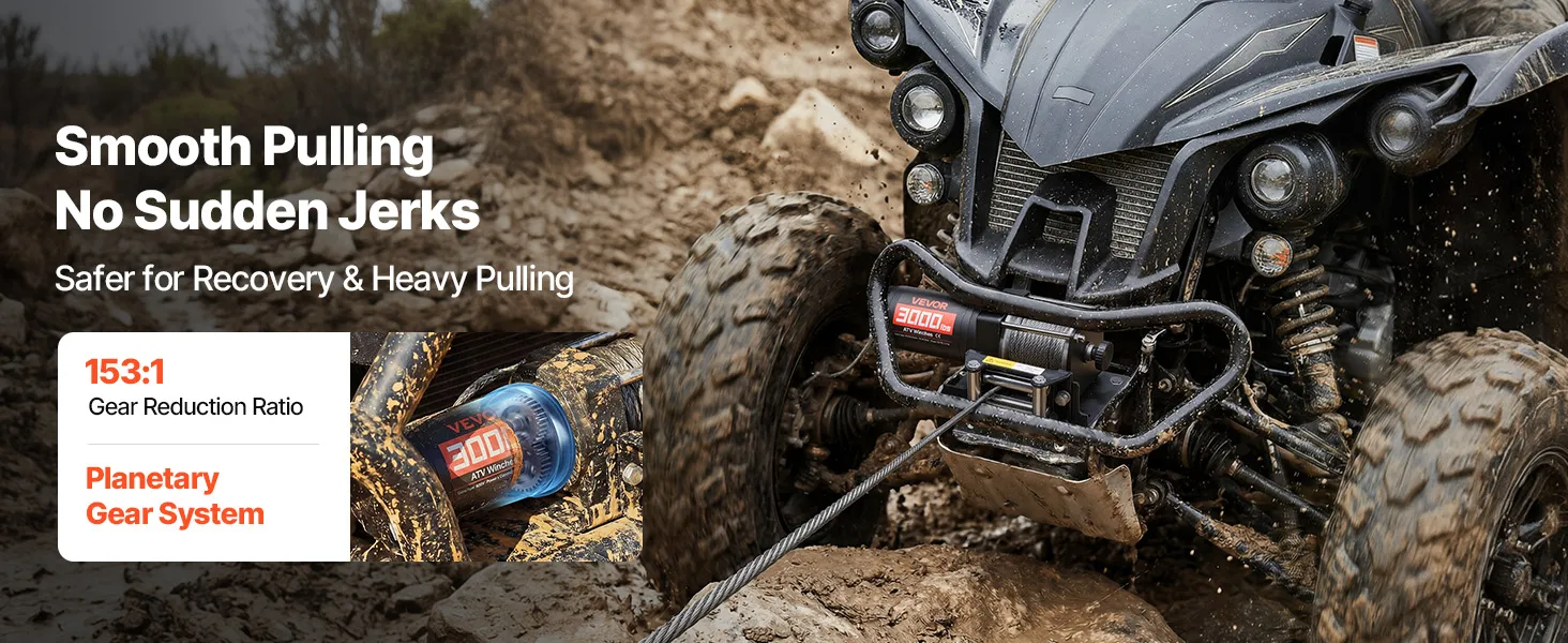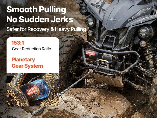 Powerful Performance: Powered by a 1.3 HP permanent magnet motor, this electric winch delivers a steady 3000 lbs pulling capacity. The 153:1 high gear reduction efficiently converts power into strong torque, helping the atv winch pull out of tough spots