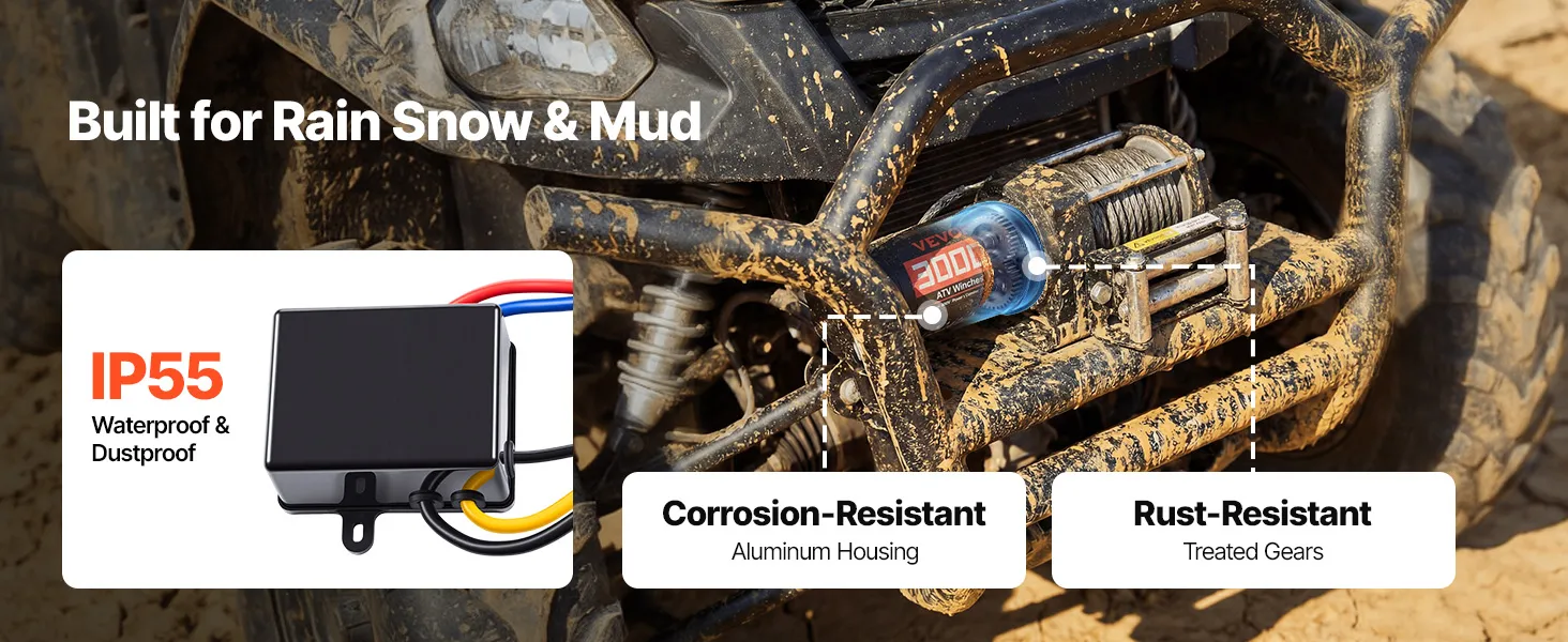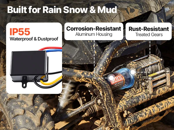 Designed for Outdoor Use: The electric winch features a premium aluminum housing and reinforced internal components, paired with an IP55-rated control box to handle splashes and muddy conditions—supporting reliable recovery and everyday utility work