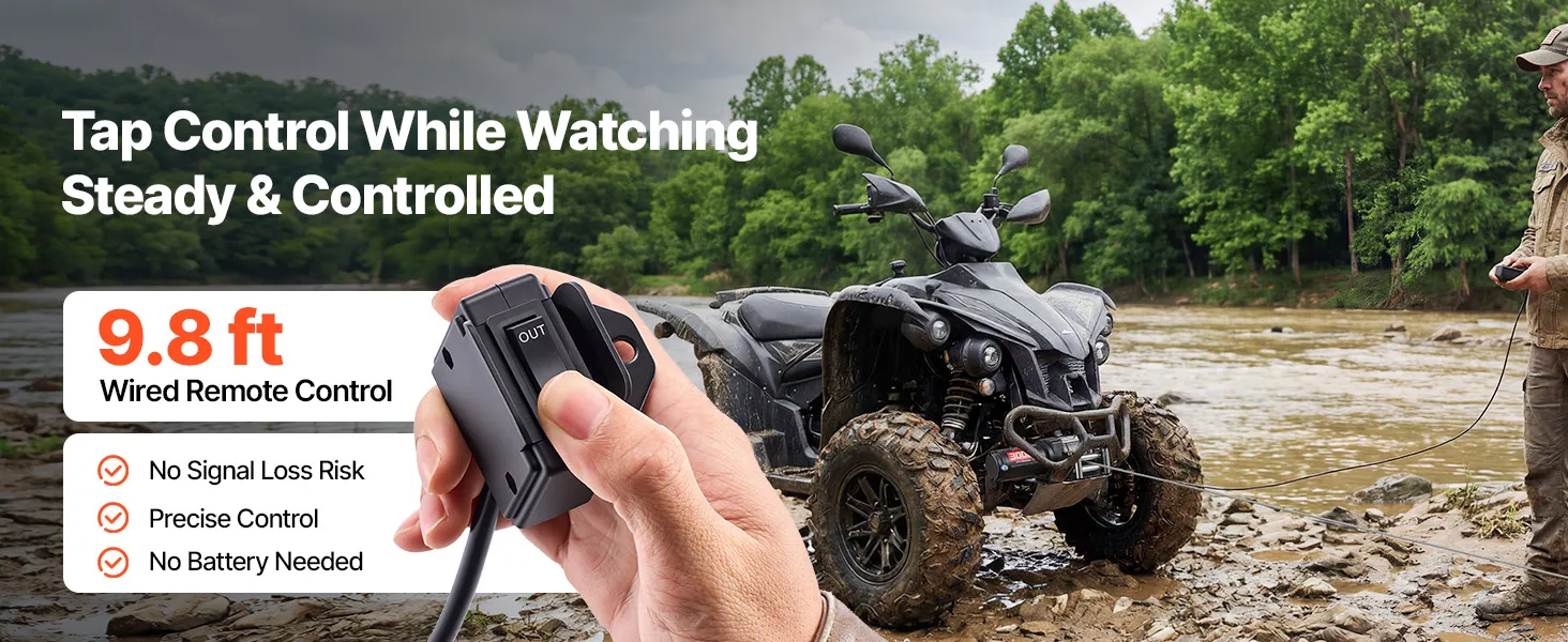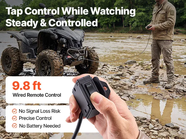 Precise Wired Control: Includes a 9.8 ft wired remote for direct, responsive operation without signal interference. Ideal for close-range, controlled recovery tasks, this 12 volt winch allows you to observe and fine-tune each pull with confidence