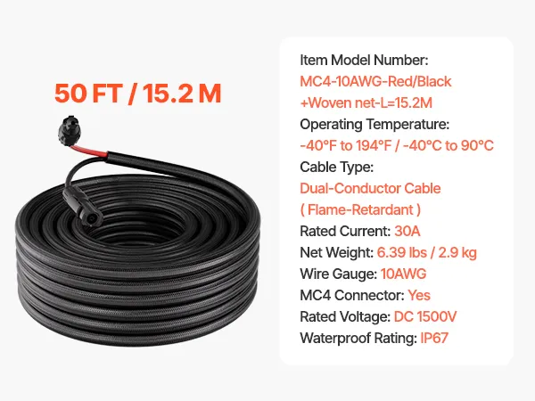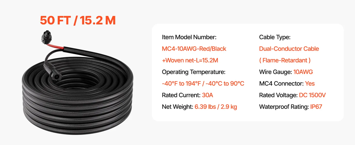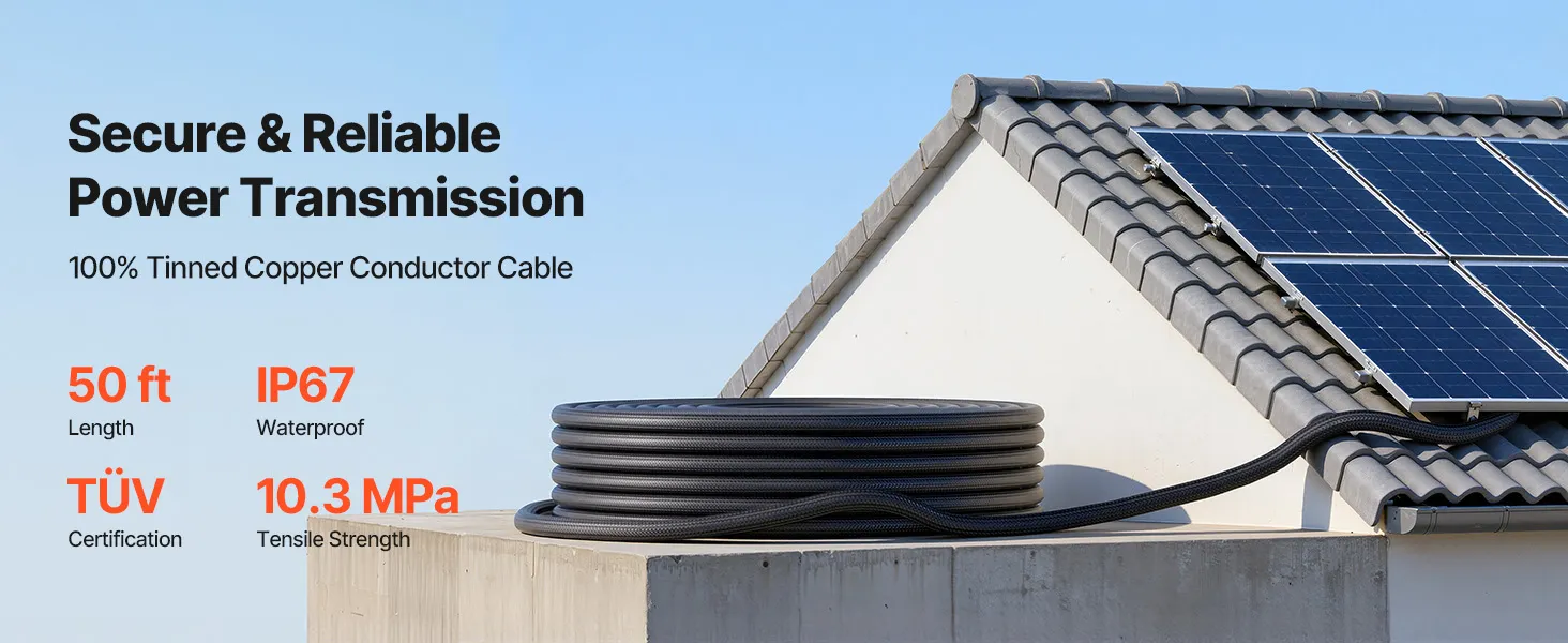 Built with 100% tinned copper and 10 AWG wire, this 50 ft cable supports high current for stable power transfer and flexible layouts. With an IP67 waterproof, XLPE jacket, flame-retardant protective sleeving, MC4 connectors, and tested to TÜV standard, it is built to last for long-term outdoor use.