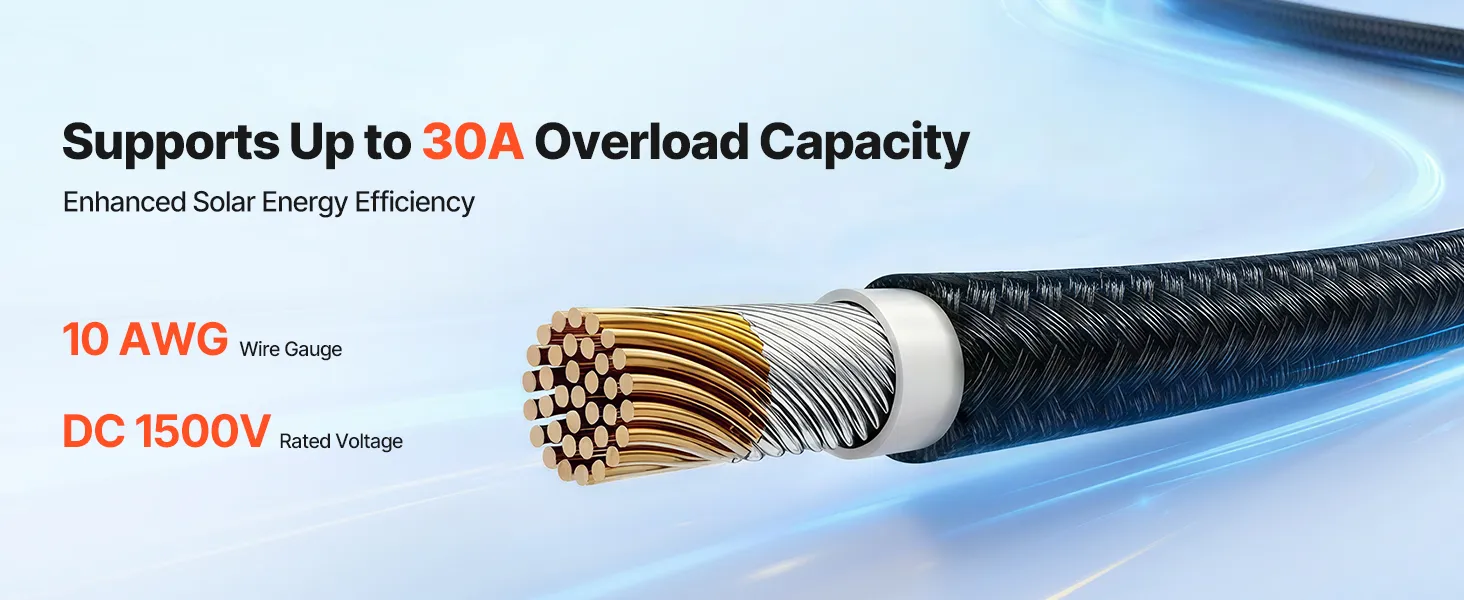 Designed to handle high current demands under strong sunlight, this solar panel extension wire supports powerful solar setups and higher system loads, ensuring compatibility with high-output equipment without risking cable damage or system instability.