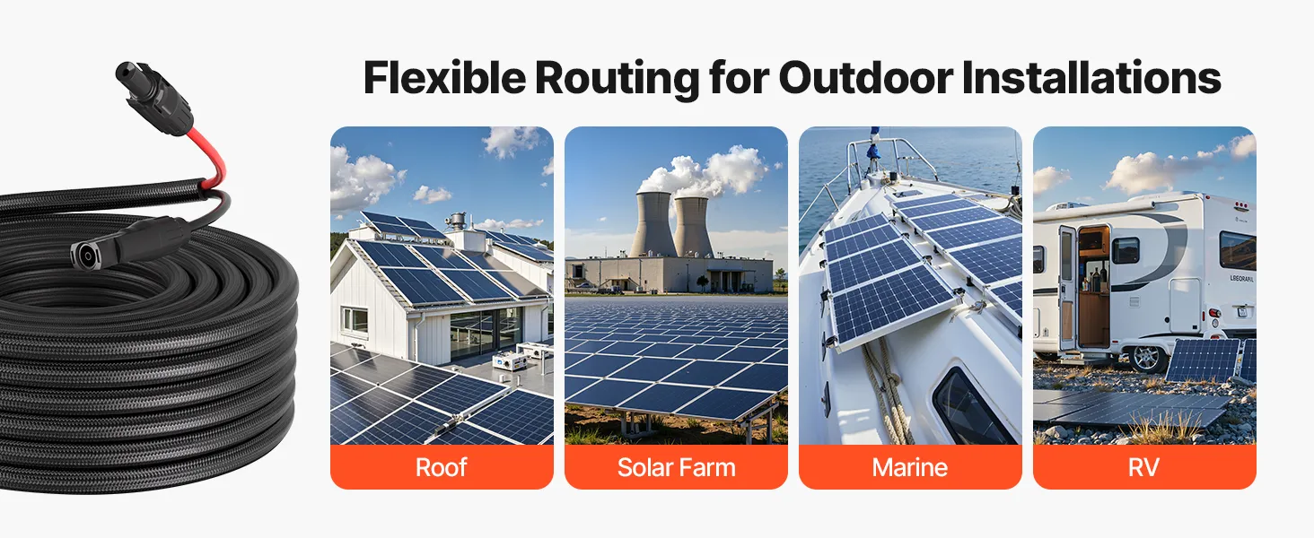 Excellent Conductivity: This solar panel extension cable features a 100% tinned copper conductor to deliver high efficiency and low resistance power transfer. It reduces energy loss and ensures stable performance even in harsh outdoor environments