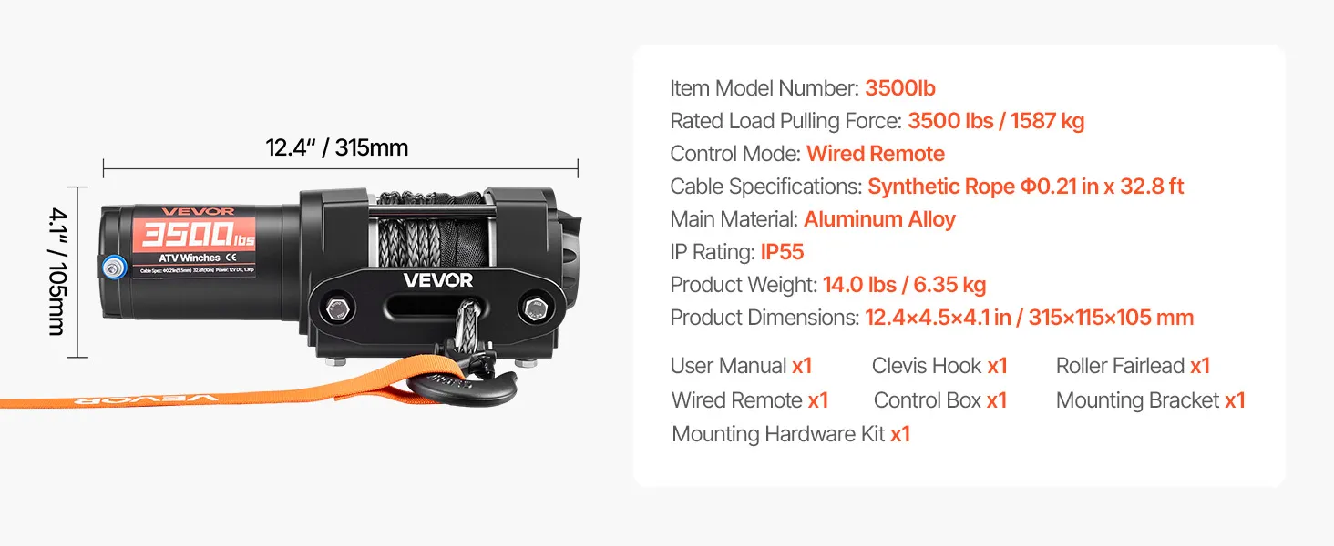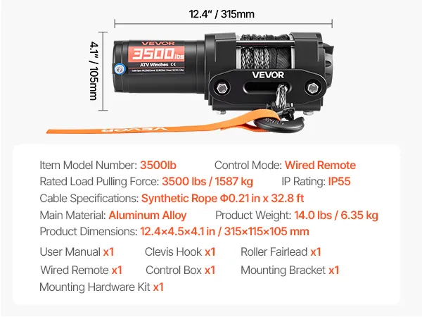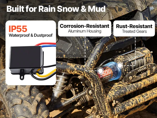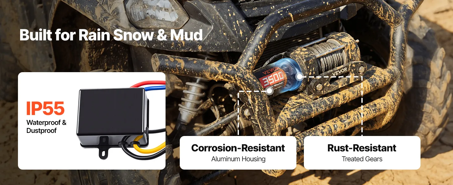 Designed for Outdoor Use: The electric winch features a premium aluminum housing and reinforced internal components, paired with an IP55-rated control box to handle splashes and muddy conditions—supporting reliable recovery and everyday utility work